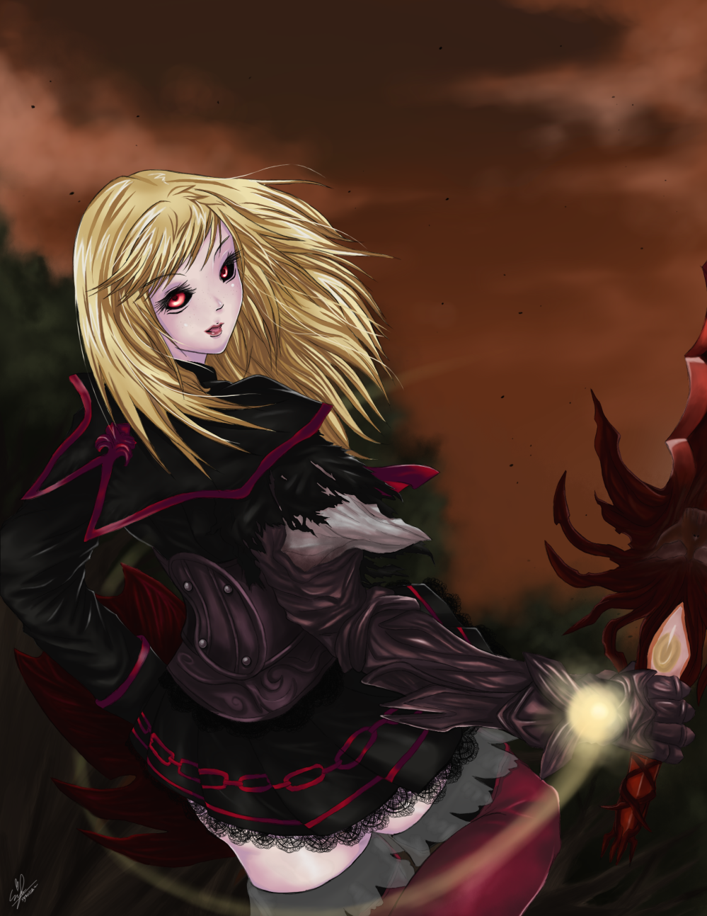 1girl aura bandai_namco black_sclera blonde_hair cloud colored_sclera commentary corruption english_commentary glowing highres holding holding_sword holding_weapon long_hair looking_at_viewer looking_back looking_to_the_side open_mouth orange_eyes outdoors parted_lips possessed pyrrha_alexandra pyrrha_omega solo soul_calibur soulcalibur soulcalibur_iv soulcalibur_v sword syahilla thighs weapon yellow_eyes
