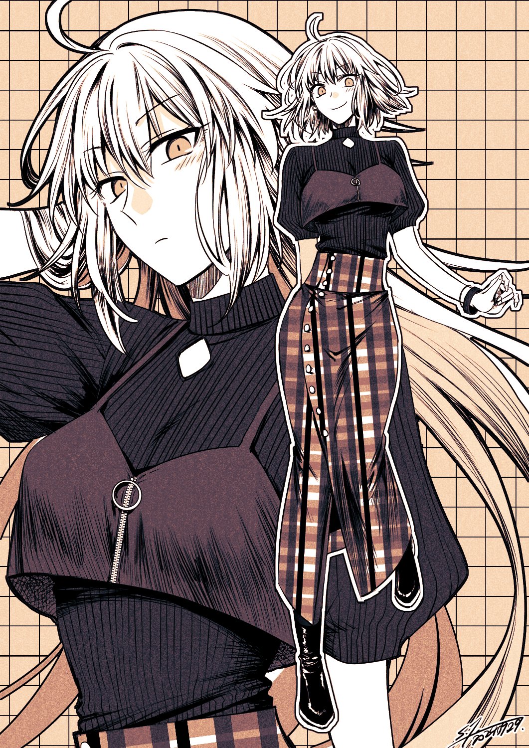 1girl ahoge boots contemporary earrings fate/grand_order fate_(series) grid_background highres jeanne_d'arc_alter_(fate) jewelry long_skirt plaid_clothes plaid_skirt ribbed_shirt sepia shirt signature single_earring skirt smile yuuzuki230 zipper