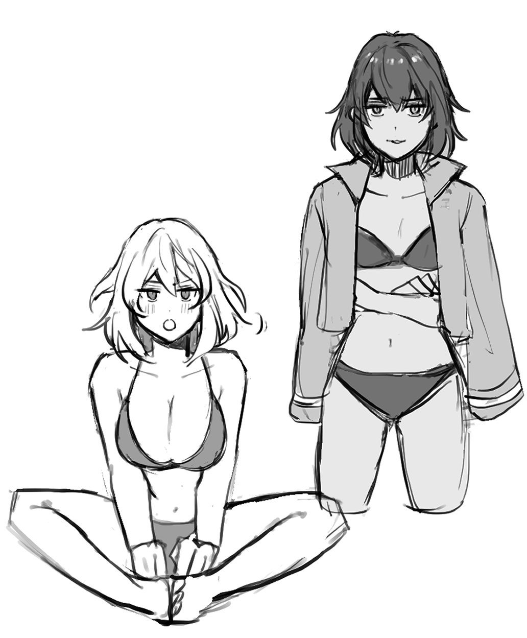 2girls andou_(girls_und_panzer) bc_freedom_military_uniform bikini blush breasts cleavage collarbone dark-skinned_female dark_skin girls_und_panzer highres jacket large_breasts moekichi multiple_girls oshida_(girls_und_panzer) sitting smile standing swimsuit swimsuit_cover-up wariza