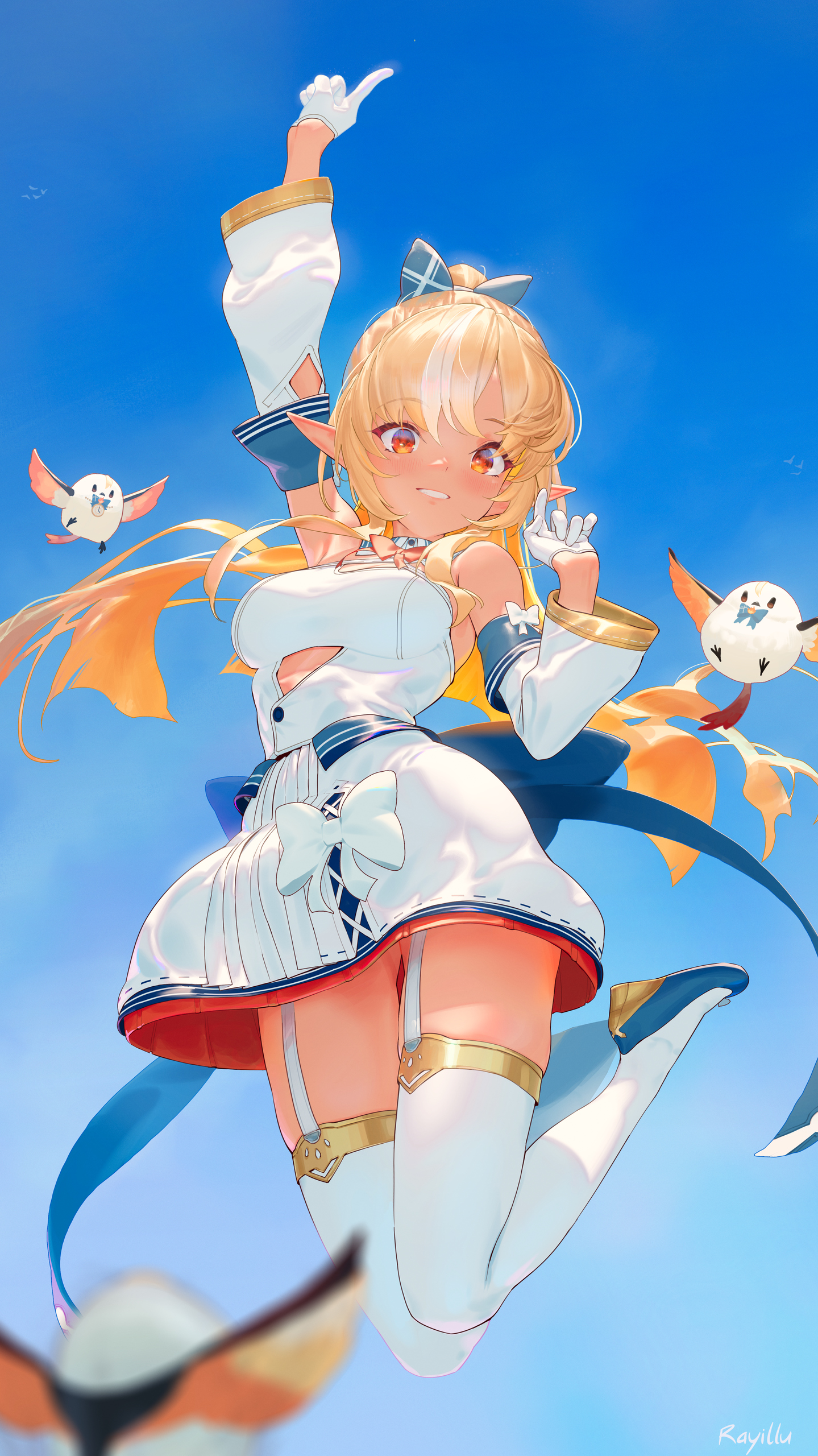 1girl absurdres arm_up back_bow blonde_hair blue_bow blue_footwear blue_sky blurry blurry_foreground blush bow skirt_bow bowtie clothing_cutout commentary cutout_above_navel day detached_collar detached_sleeves elf elfriend_(shiranui_flare) garter_straps gloves grin hair_bow half_gloves hand_up high_heels high_ponytail highres hololive jumping large_bow long_hair looking_at_viewer miniskirt multicolored_hair outdoors pleated_skirt pointing pointing_up pointy_ears ponytail pumps rayillu red_bow red_bowtie shiranui_flare shiranui_flare_(1st_costume) shirt sidelocks skirt skirt_set sky sleeveless sleeveless_shirt smile solo streaked_hair thighhighs virtual_youtuber white_garter_straps white_gloves white_shirt white_skirt white_thighhighs wide_sleeves