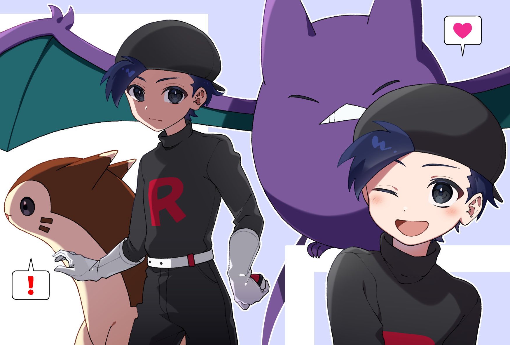 ! 1boy ;d belt black_eyes black_hat black_pants black_shirt blue_hair blush closed_mouth commentary crobat ethan_(pokemon) furret gen_2_pokemon gloves hat heart highres holding holding_poke_ball long_sleeves male_focus nintendo nisanrei121 one_eye_closed open_mouth pants poke_ball poke_ball_(basic) pokemon pokemon_(creature) pokemon_heartgold_and_soulsilver shirt short_hair smile speech_bubble spoken_exclamation_mark spoken_heart team_rocket team_rocket_uniform teeth white_belt white_gloves wings