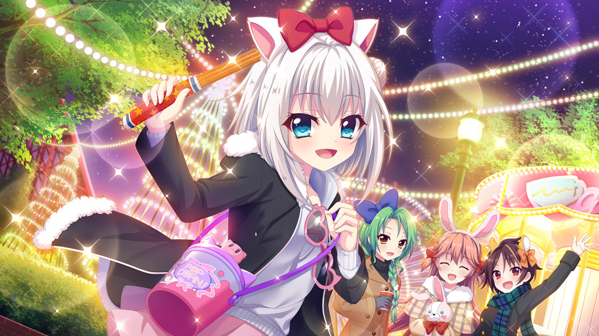 4girls :d amusement_park animal_ear_hairband animal_ears arm_up bandou_mikuru birthday black_coat black_jacket blonde_hair blue_bow blue_eyes blue_scarf blue_shirt blush bow bowtie brown_coat brown_hair bucket capelet cat_ear_hairband cat_ears christmas_lights churro closed_eyes coat cup dot_nose dutch_angle fake_animal_ears film_grain food fur-trimmed_capelet fur-trimmed_jacket fur_trim game_cg green_hair haeno_akari hair_bow hair_bun hairband hand_up heart heart-shaped_eyewear heart_cheeks hedge holding holding_cup holding_food holding_stuffed_toy izumi_tsubasu jacket lamppost large_bow lens_flare long_hair long_sleeves looking_at_viewer multicolored_hair multiple_girls night nishidate_haku non-web_source official_art open_mouth orange_bow orange_hair outdoors pink_skirt plaid_capelet plaid_clothes plaid_scarf rabbit_ear_hairband rabbit_ears re:stage! red_bow red_bowtie red_eyes roller_coaster scarf self-datamine shirokita_kuroha shirt short_hair sidelocks single_side_bun skirt sky smile sparkle star_(sky) starry_sky streaked_hair string_of_light_bulbs stuffed_animal stuffed_rabbit stuffed_toy sunglasses tree trench_coat two-tone_hair two_side_up unworn_eyewear waving white_hair yellow_capelet yellow_eyes