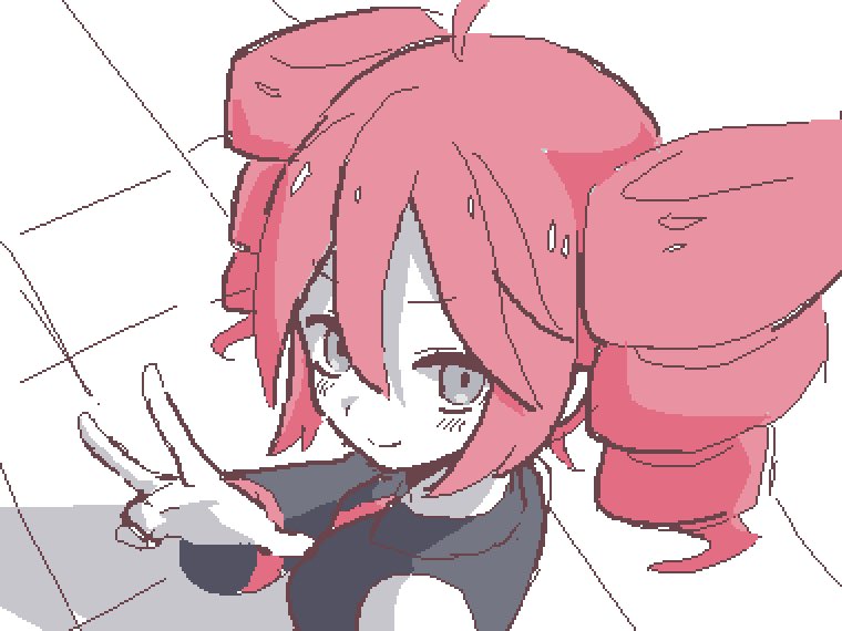 1girl ahoge alternate_eye_color black_sleeves detached_sleeves double-parted_bangs drill_hair floor from_above grey_eyes hair_between_eyes kasane_teto kasane_teto_(utau) looking_at_viewer looking_up pixel_art red_hair shirt sleeveless sleeveless_shirt smile solo sparseseethe tile_floor tiles twin_drills upper_body utau w