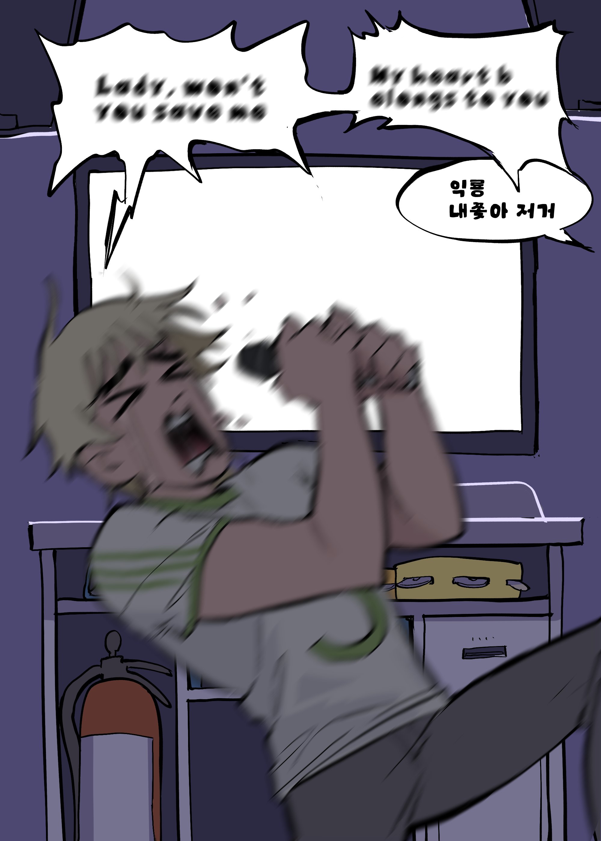 >_< 1boy absurdres blonde_hair bnm6517 commentary_request english_text highres holding holding_microphone karaoke korean_commentary korean_text lyrics male_focus microphone mixed-language_text motion_blur music open_mouth scott_pilgrim_(series) scott_pilgrim_takes_off shirt short_hair short_sleeves singing solo steelheart_(band) todd_ingram