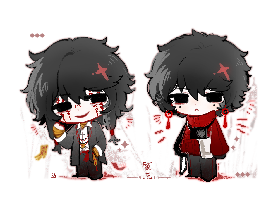2boys :< bag black_eyes black_gloves black_hair black_jacket black_pants camera camera_around_neck chibi chibi_only chinese_commentary closed_mouth collared_shirt commentary_request earrings facepaint gloves hair_between_eyes hand_up high_collar jacket jewelry li_yuting_(male) male_focus messenger_bag mole mole_under_each_eye mole_under_eye multiple_boys multiple_moles open_clothes open_jacket open_mouth pants red_jacket shirt short_hair short_hair_with_long_locks shoulder_bag smile soyuii touqi_guaitan white_background white_bag white_shirt ziche_fuzhao