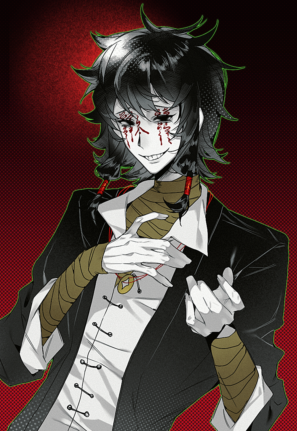 1boy bandaged_arm bandaged_neck bandages black_eyes black_hair black_jacket chinese_commentary coin coin_on_string collared_shirt colored_skin commentary_request facepaint green_outline grin hand_on_own_chest hand_up highres holed_coin jacket male_focus medium_hair mole mole_under_eye open_clothes open_collar open_jacket outline red_background shirt smile solo touqi_guaitan upper_body white_shirt white_skin ziche_fuzhao ziyizy534