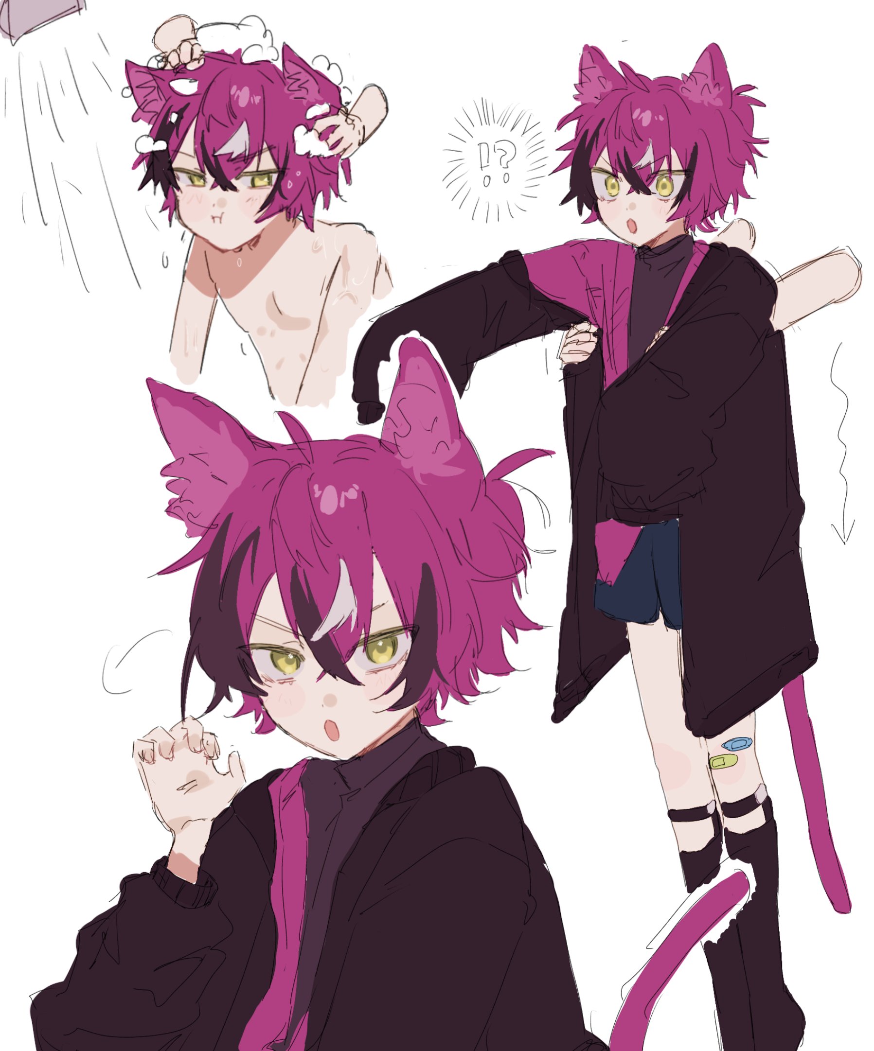 !? 1boy :t aged_down animal_ear_fluff animal_ears arm_up arrow_(symbol) bandaid bandaid_on_leg bare_shoulders black_shirt black_socks blue_shorts claw_pose commentary disembodied_hand doku_tanuki123 doppio_dropscythe hair_between_eyes highres jacket kemonomimi_mode legwear_garter looking_at_viewer looking_to_the_side male_focus multicolored_hair multiple_views nijisanji nijisanji_en open_mouth purple_hair shirt shorts shower_head simple_background soap soap_bubbles socks streaked_hair topless_male turtleneck two-sided_fabric two-sided_jacket virtual_youtuber washing_hair wet wet_hair white_background yellow_eyes
