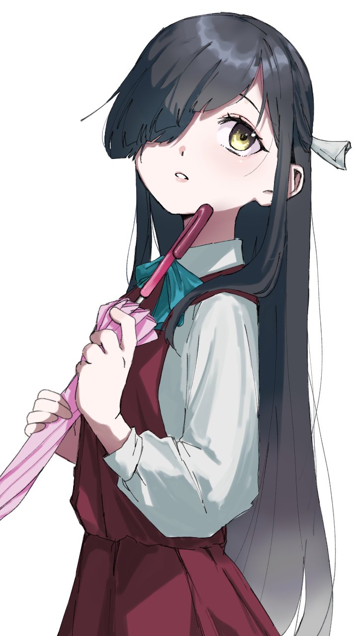 1girl black_hair bow bowtie closed_umbrella collared_shirt dress hayashimo_(kancolle) highres holding holding_umbrella kantai_collection long_hair looking_up parted_lips pinafore_dress shirt simple_background sleeveless sleeveless_dress solo tone_gawa10 umbrella white_background yellow_eyes