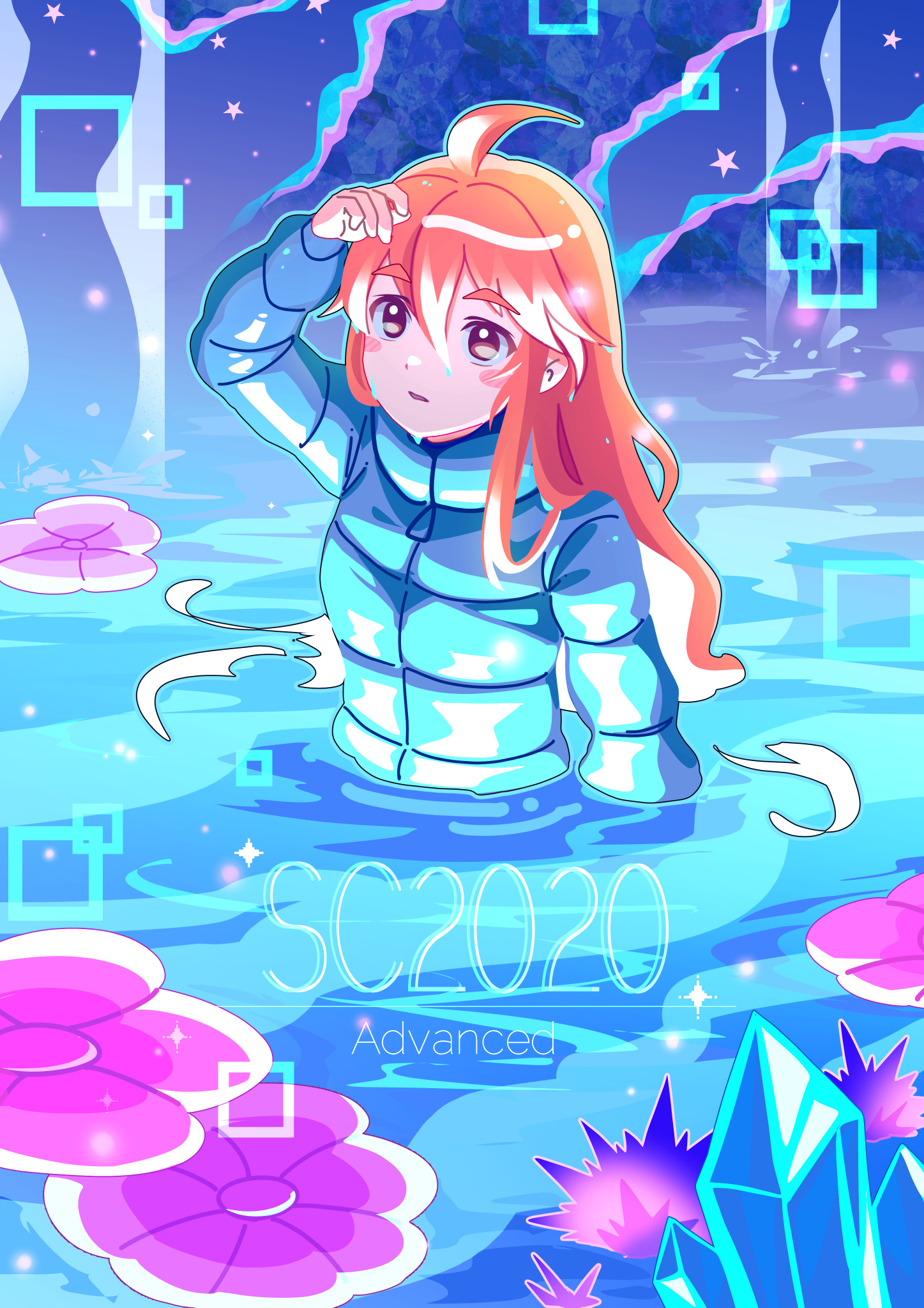 1girl ahoge blue_jacket brown_eyes celeste_(game) coat crystal fuwamoko_momen_toufu highres jacket long_hair long_sleeves madeline_(celeste) orange_hair shirt solo upper_body very_long_hair water wet winter_clothes winter_coat zipper