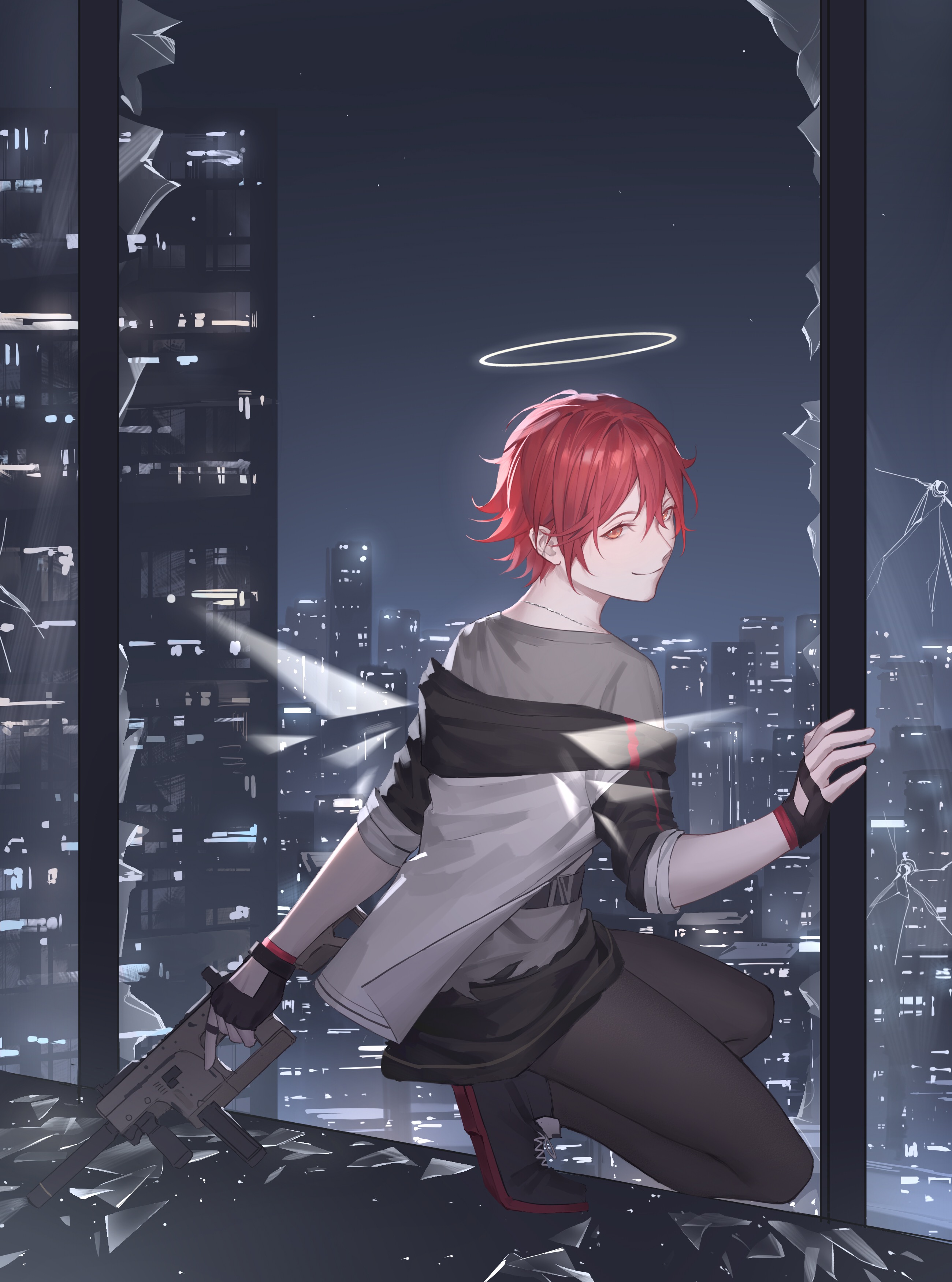 1girl absurdres alicescorpio_yeji arknights black_gloves black_pantyhose black_shoes broken_glass broken_window building chinese_commentary cityscape closed_mouth commentary_request detached_wings exusiai_(arknights) fingerless_gloves glass gloves grey_shirt gun halo highres holding holding_gun holding_weapon hood hood_down hooded_jacket jacket looking_back night orange_eyes pantyhose red_hair shirt shoes short_hair sky skyscraper sleeves_rolled_up smile solo squatting star_(sky) weapon white_jacket wings