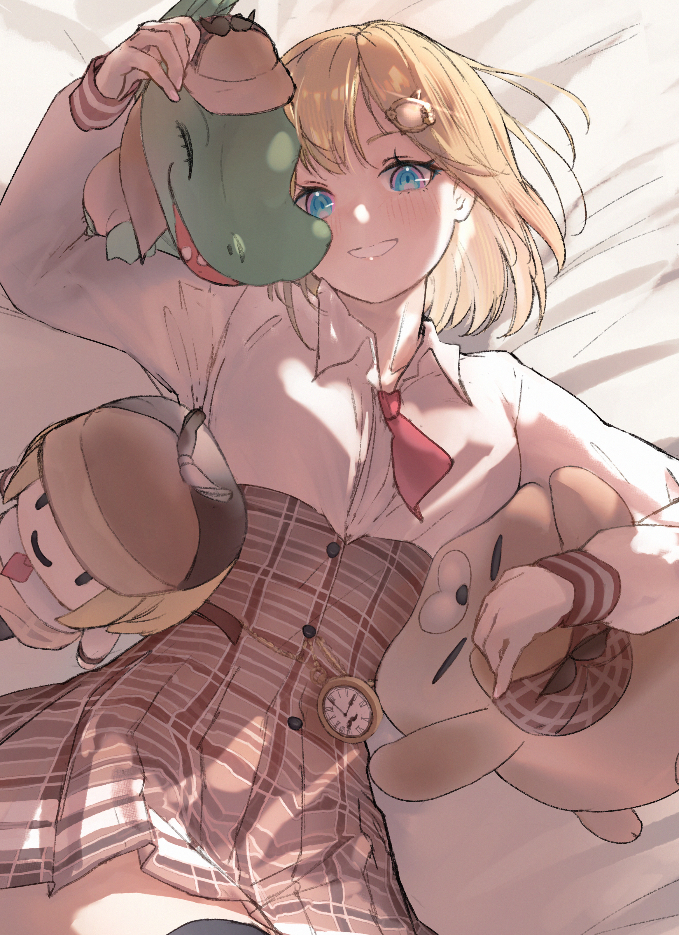 1girl absurdres black_thighhighs blonde_hair blue_eyes bluedoggie brown_skirt bubba_(watson_amelia) collared_shirt dog headpat high-waist_skirt highres hololive hololive_english investigator_(watson_amelia) looking_at_viewer lying necktie on_back red_necktie shirt short_hair skirt smile smol_ame stopwatch thighhighs virtual_youtuber watch watson_amelia watson_amelia_(1st_costume) white_shirt