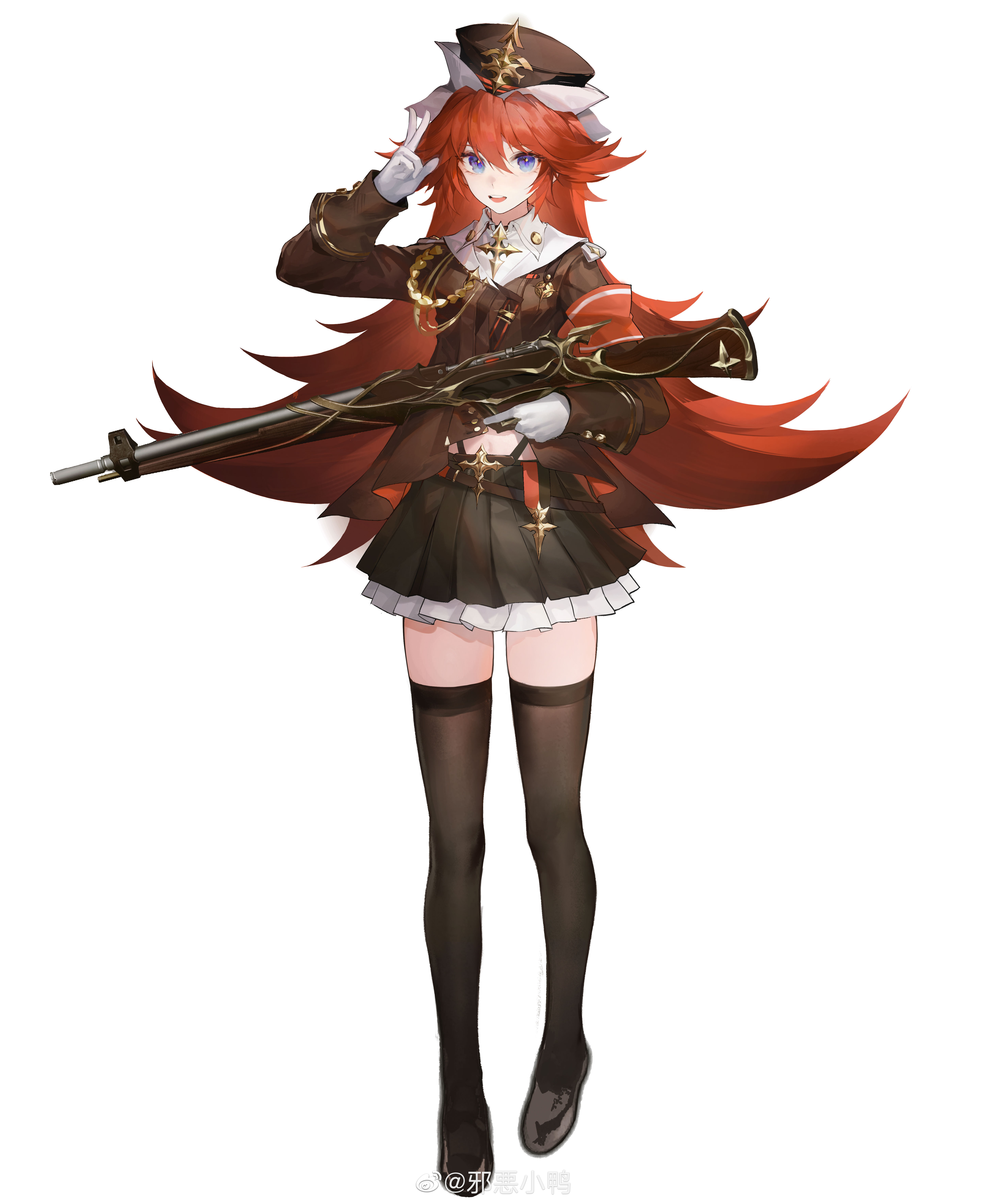 :d absurdres armband black_hat black_shoes black_skirt black_thighhighs blue_eyes brown_jacket collared_shirt fang gloves gun hair_between_eyes hand_up hat highres holding holding_gun holding_weapon jacket layered_skirt loafers long_hair long_sleeves midriff miniskirt mrilsweet navel official_art open_mouth pleated_skirt red_armband red_hair rifle salute shirt shoes skin_fang skirt smile standing tachi-e thighhighs two-finger_salute very_long_hair watermark weapon weibo_watermark white_background white_gloves white_shirt wind_fantasy_(series) wind_fantasy_destiny zettai_ryouiki