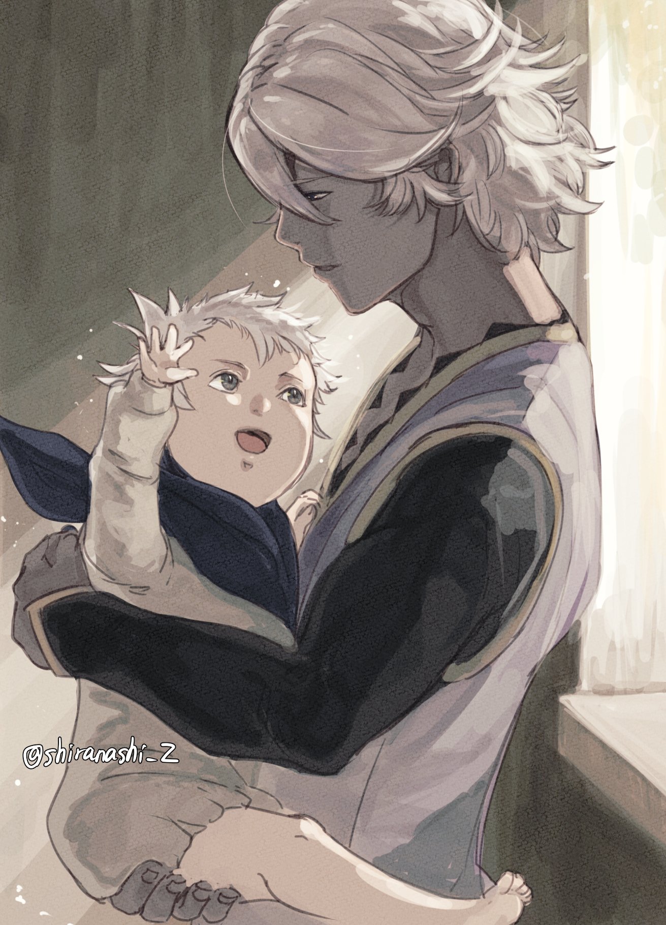 2boys aged_down baby carrying carrying_baby carrying_person dark-skinned_male dark_skin father_and_child father_and_son fire_emblem fire_emblem_fates highres male_focus male_kana_(fire_emblem) multiple_boys niles_(fire_emblem) nintendo open_mouth parent_and_child shiranashi_z white_hair