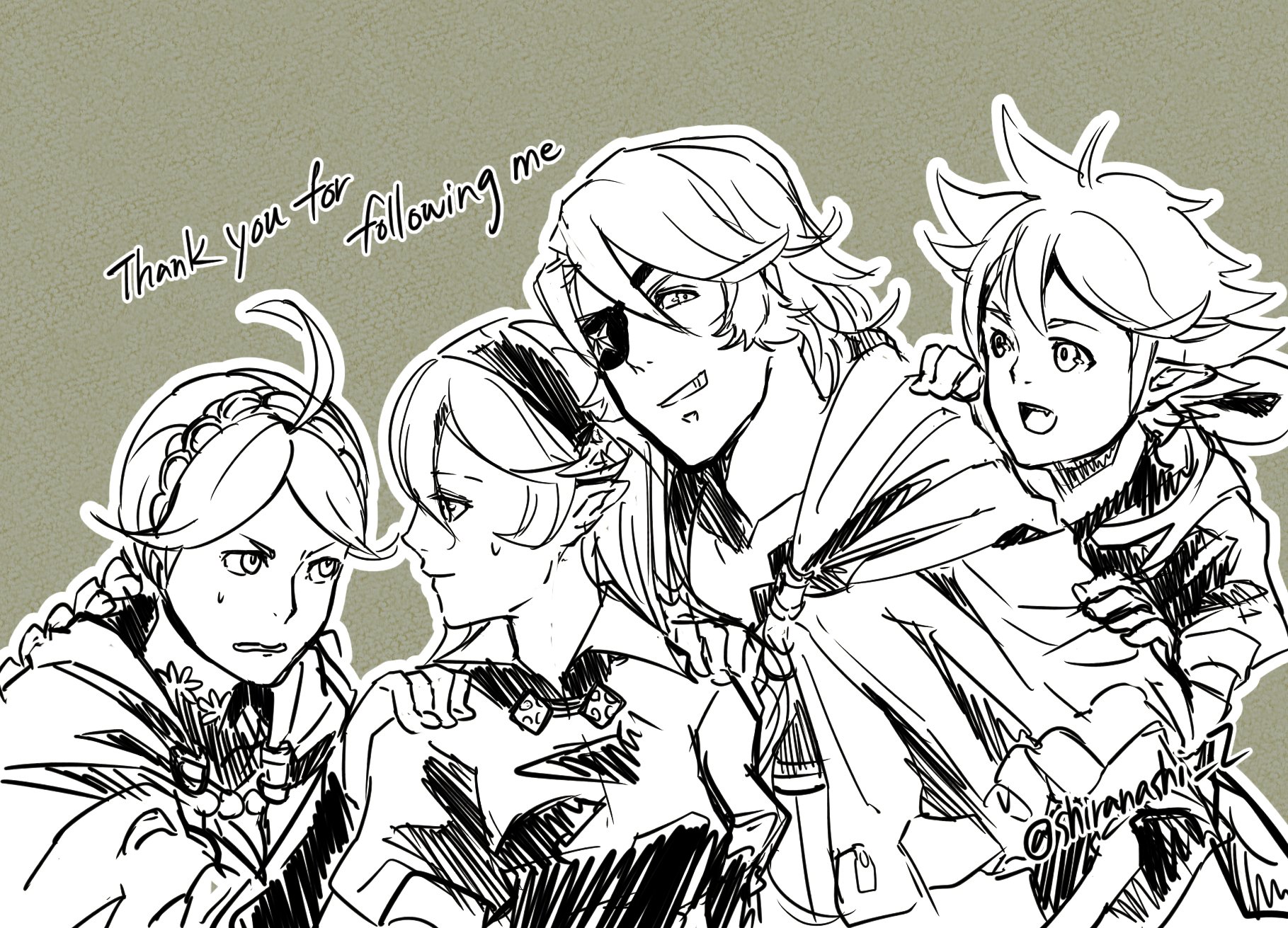2boys 2girls ahoge female_corrin_(fire_emblem) eyepatch fire_emblem fire_emblem_fates greyscale highres looking_at_another looking_at_viewer male_kana_(fire_emblem) monochrome multiple_boys multiple_girls niles_(fire_emblem) nina_(fire_emblem) nintendo parted_bangs shiranashi_z thank_you
