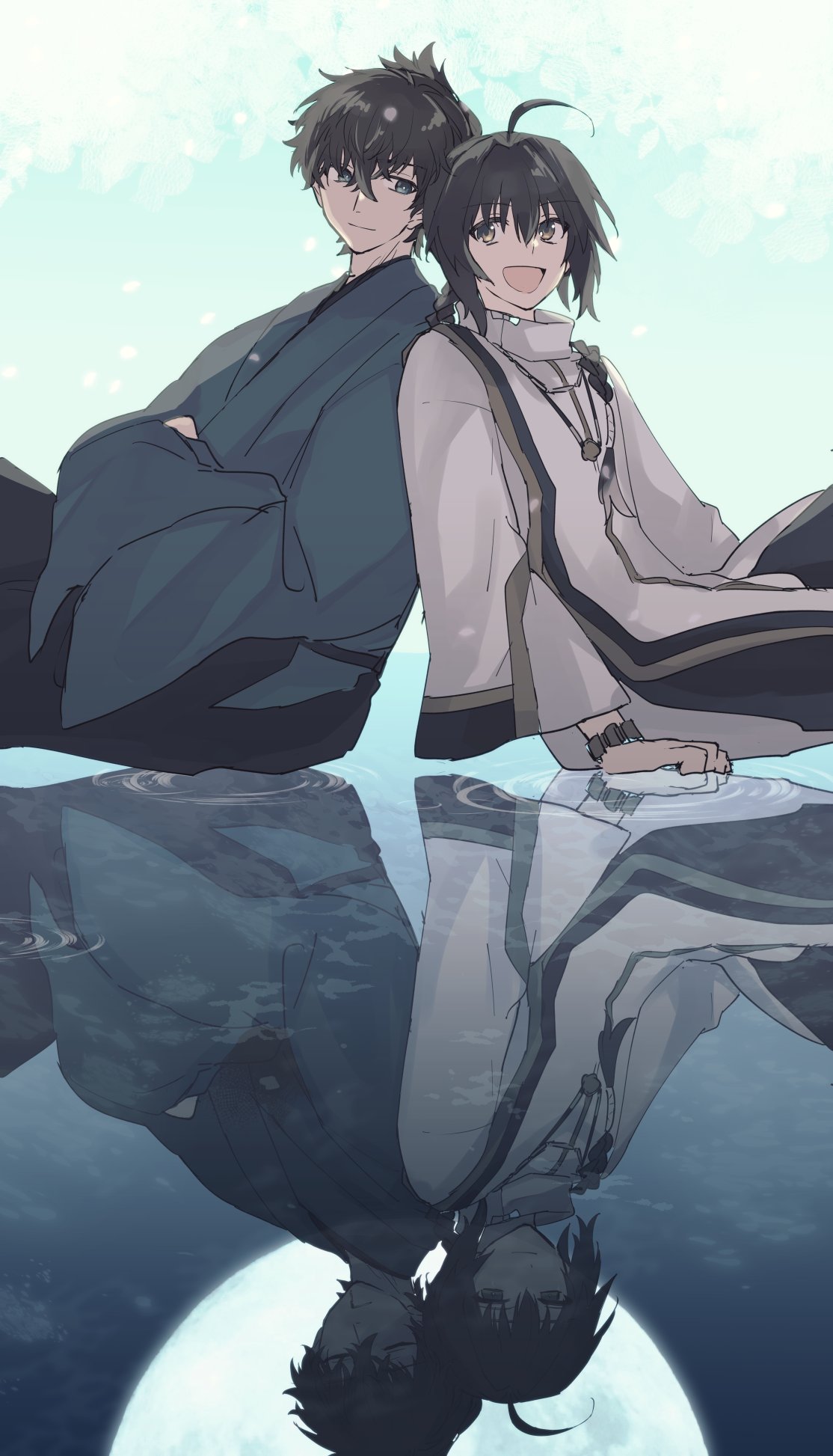 1boy 1other ahoge amachi_(yuuin) amulet androgynous back-to-back black_hair black_hakama blood blood_from_mouth blue_kimono bracelet braid closed_eyes crossed_arms different_reflection fate/samurai_remnant fate_(series) full_moon grey_eyes hakama half-closed_eyes highres japanese_clothes jewelry kimono looking_at_another miyamoto_iori_(fate) moon necklace open_mouth reflection reflective_liquid sidelocks single_braid sitting smile topknot yamato_takeru_(fate) yellow_eyes