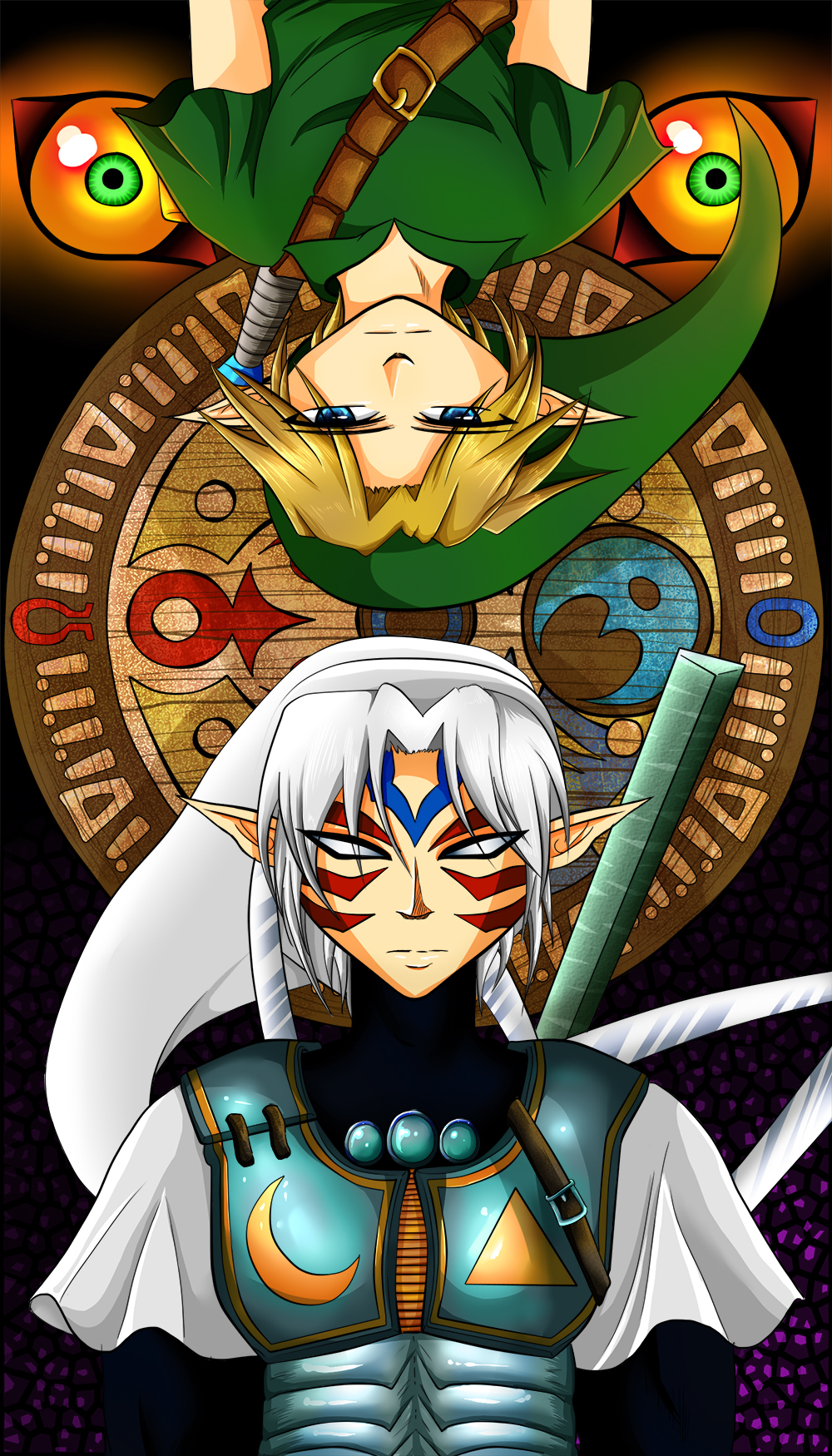 2boys alamino alternate_costume armor blonde_hair blue_eyes bodysuit colored_sclera commentary crescent crescent_print dark_persona dual_persona english_commentary expressionless facial_mark facial_tattoo fierce_deity glowing glowing_eyes green_eyes green_hat hat highres link looking_at_viewer majora_(zelda) multiple_boys nintendo no_pupils official_alternate_costume orange_sclera pointy_ears possessed possession short_hair short_sleeves tattoo the_legend_of_zelda the_legend_of_zelda:_majora's_mask triangle triangle_print upside-down white_eyes white_hair white_hat young_link