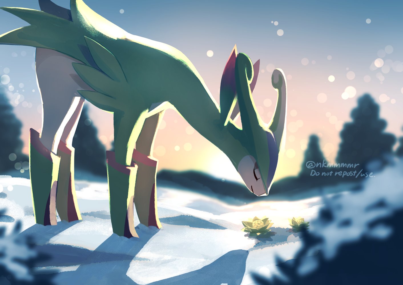 animal_focus antlers blurry blurry_background closed_eyes closed_mouth deer flower funahashi_(nkmmmmr) gen_5_pokemon green_footwear green_fur horns legendary_pokemon nintendo no_humans pokemon pokemon_(creature) snow solo sunset tree two-tone_fur virizion yellow_flower yellow_fur