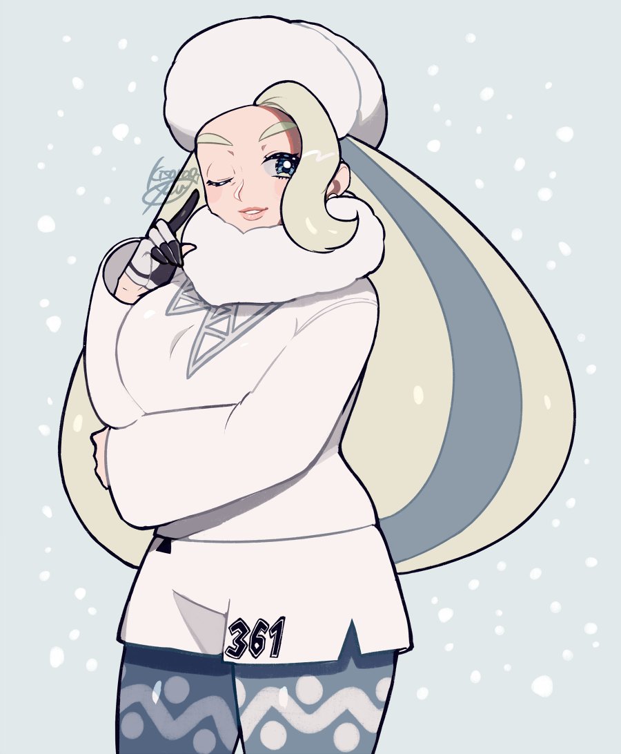 1girl arm_under_breasts artist_name blonde_hair blue_eyes breasts earrings fur_collar fur_hat gloves hand_up hat index_finger_raised jewelry kisaragi_yuu_(fallen_sky) large_breasts long_hair long_sleeves mature_female melony_(pokemon) multicolored_hair nintendo one_eye_closed pantyhose pantyhose_under_shorts pearl_earrings pokemon pokemon_sword_and_shield shorts side_slit side_slit_shorts signature single_glove smile solo streaked_hair sweater ushanka white_sweater
