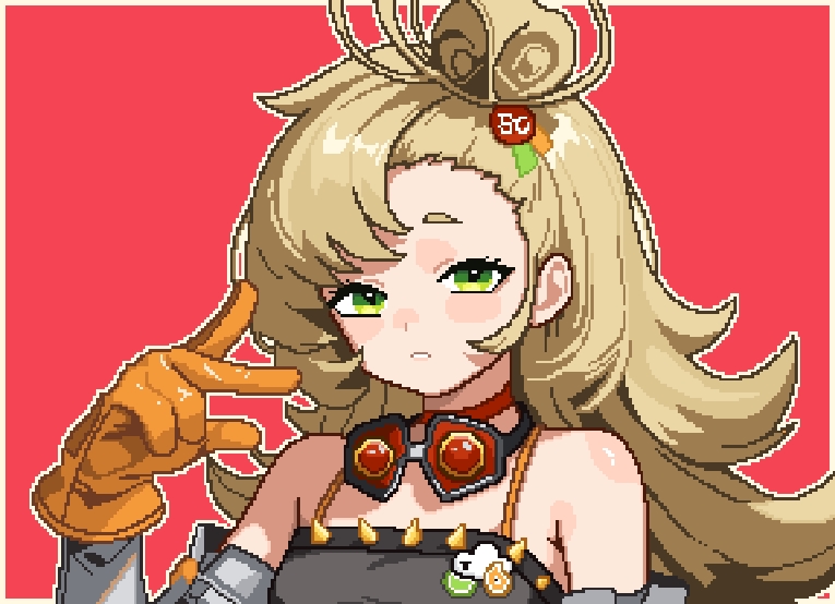1girl blonde_hair crop_top gloves goggles goggles_around_neck green_eyes hair_bun loblob_art long_hair looking_at_viewer orange_gloves parted_lips piper_wheel pixel_art red_background short_eyebrows simple_background solo upper_body zenless_zone_zero