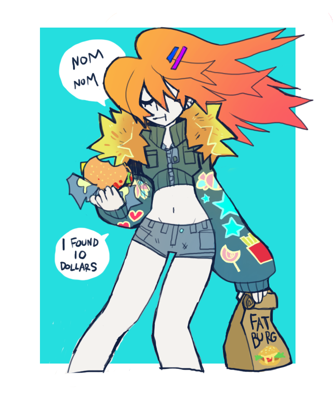 burger cropped_legs cyborg cyborg_009 eating food jet_link long_hair orange_hair shorts trap white_background