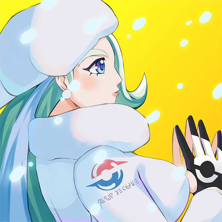 1girl blue_eyes breasts earrings fur_collar fur_hat gloves gradient_background hat jewelry large_breasts long_hair long_sleeves mature_female melony_(pokemon) multicolored_hair nintendo pearl_earrings pokemon pokemon_sword_and_shield single_glove solo streaked_hair sweater tako_maru upper_body ushanka white_sweater yellow_background