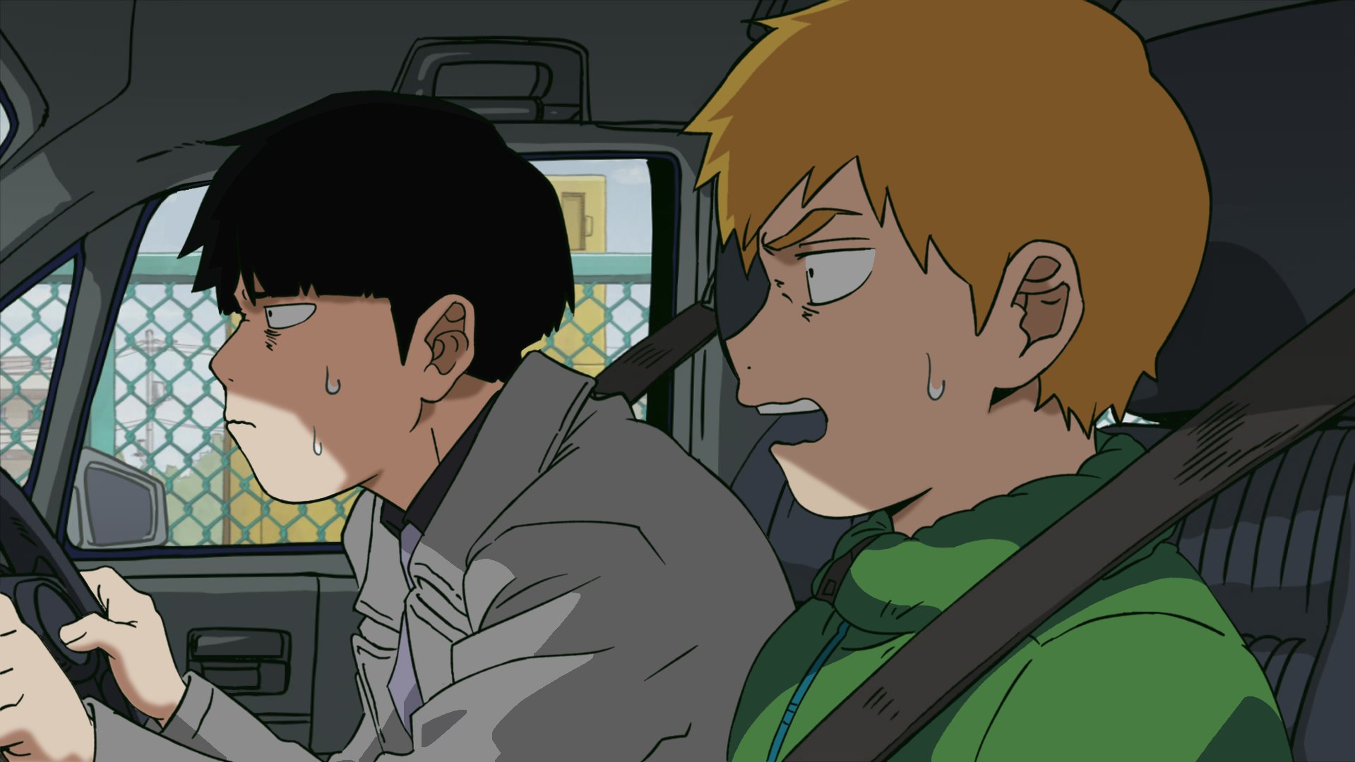2boys aged_down aged_up alternate_universe black_eyes black_hair black_shirt blonde_hair car_interior ch0og0o closed_mouth collared_shirt driving green_jacket grey_jacket highres jacket kageyama_shigeo male_focus mob_psycho_100 multiple_boys open_mouth reigen_arataka seatbelt shirt teeth upper_teeth_only