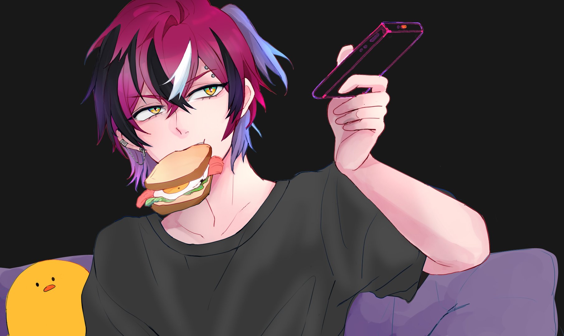 1boy 86nohamu arm_up bacon black_background black_shirt bread collarbone colored_skin commentary_request controller crew_neck doppio_dropscythe ear_piercing earrings egg_(food) food food_in_mouth hair_behind_ear hair_between_eyes highres holding holding_controller holding_remote_control jewelry looking_to_the_side male_focus multicolored_eyes multicolored_hair multiple_earrings nijisanji nijisanji_en piercing ponytail purple_hair remote_control sandwich scythekick_(doppio_dropscythe) shirt short_ponytail short_sleeves simple_background slit_pupils solo streaked_hair t-shirt upper_body virtual_youtuber yellow_skin