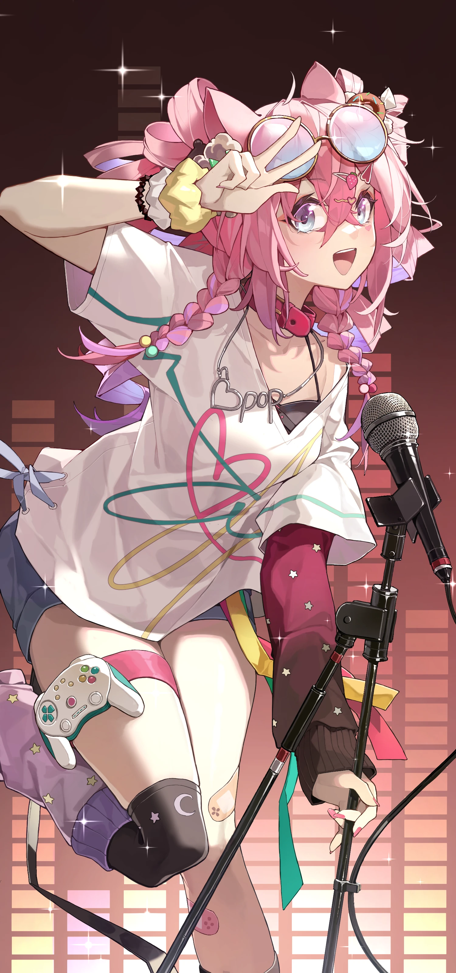 1girl :d absurdres animal_ears arknights arm_warmers bandaid bandaid_on_leg belt_collar black_arm_warmers black_camisole black_thighhighs blue_eyes blue_shorts bracelet braid camisole cat_ears collar commentary_request controller crescent crescent_pin donut_hair_ornament drill_hair eyewear_on_head feet_out_of_frame food-themed_hair_ornament foot_up game_controller gradient_arm_warmers gradient_eyes hair_between_eyes hair_bobbles hair_ornament hairclip hand_up heart heart_necklace heart_print highres holding holding_microphone_stand jewelry leg_warmers lingyu_ovo long_hair looking_at_viewer microphone microphone_stand multicolored_eyes necklace open_mouth pink_arm_warmers pink_collar pink_eyes pink_hair pink_leg_warmers pink_nails round_eyewear scrunchie shirt shorts single_arm_warmer smile solo sparkle strawberry_hair_ornament teeth thigh_strap thighhighs twin_braids u-official_(arknights) upper_teeth_only w white_shirt wrist_scrunchie
