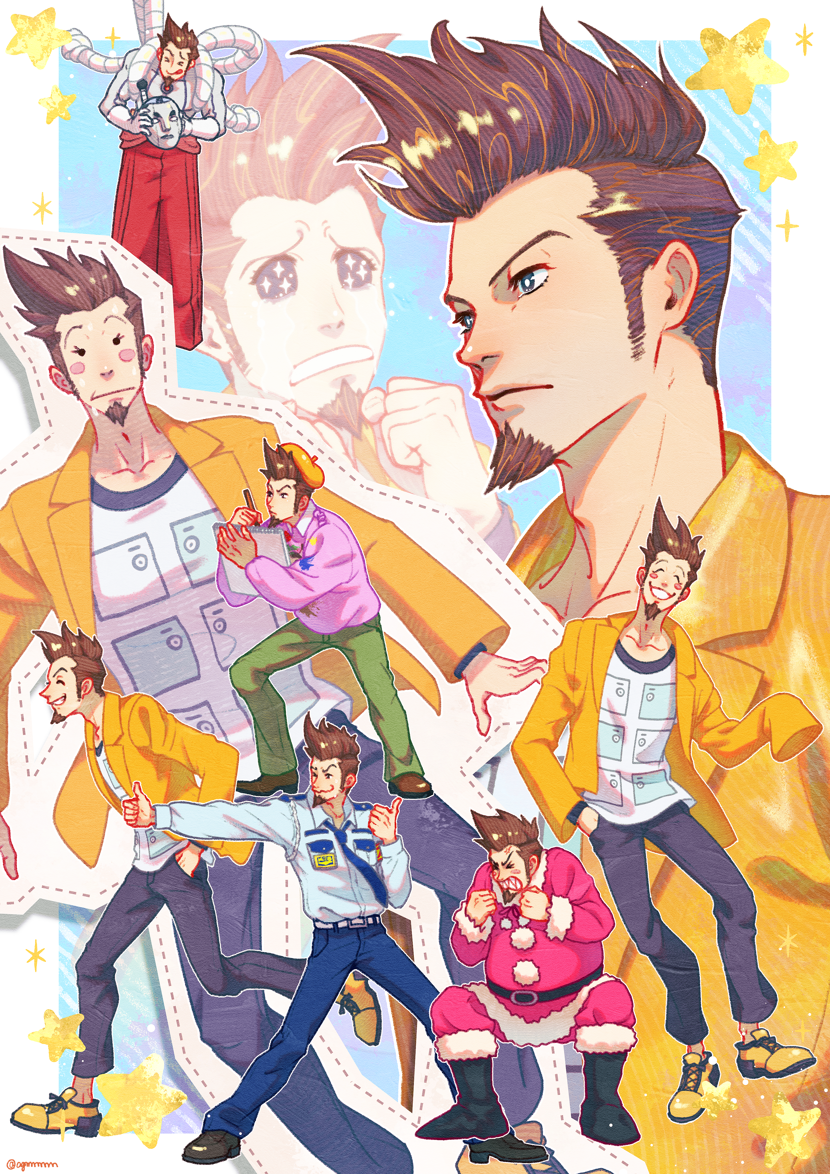 >_< 6+boys :q ^_^ absurdres ace_attorney angry belt beret black_belt black_footwear black_pants blue_eyes blue_necktie blue_pants blue_shirt blush_stickers boots border brown_footwear brown_hair clenched_hands closed_eyes collarbone collared_shirt commentary_request dotted_line double_thumbs_up facial_hair goatee green_pants hakama hakama_skirt hand_in_pocket hand_up hands_up hasekou_g hat highres holding holding_mask holding_pencil holding_sketchbook jacket japanese_clothes larry_butz male_focus mask multiple_boys multiple_persona multiple_views necktie open_clothes open_jacket orange_hat orange_jacket outside_border pants pencil police police_uniform print_shirt projected_inset santa_costume sharp_teeth shirt shirt_tucked_in shoes short_hair sketchbook skirt smile sparkle sparkling_eyes star_(symbol) teeth tehepero thumbs_up tongue tongue_out twitter_username white_belt white_border white_shirt yellow_shoes