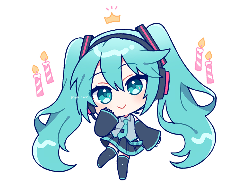 1girl :> ^^^ aplerichi aqua_eyes aqua_hair aqua_necktie arm_tattoo black_boots black_skirt black_sleeves blush boots candle chibi closed_mouth collared_shirt commentary fire full_body grey_shirt hair_between_eyes hatsune_miku headphones headset leg_up long_hair long_sleeves looking_at_viewer necktie pleated_skirt shirt simple_background skirt sleeveless sleeveless_shirt sleeves_past_wrists smile solo tattoo thigh_boots tie_clip triangle_mouth twintails very_long_hair vocaloid white_background