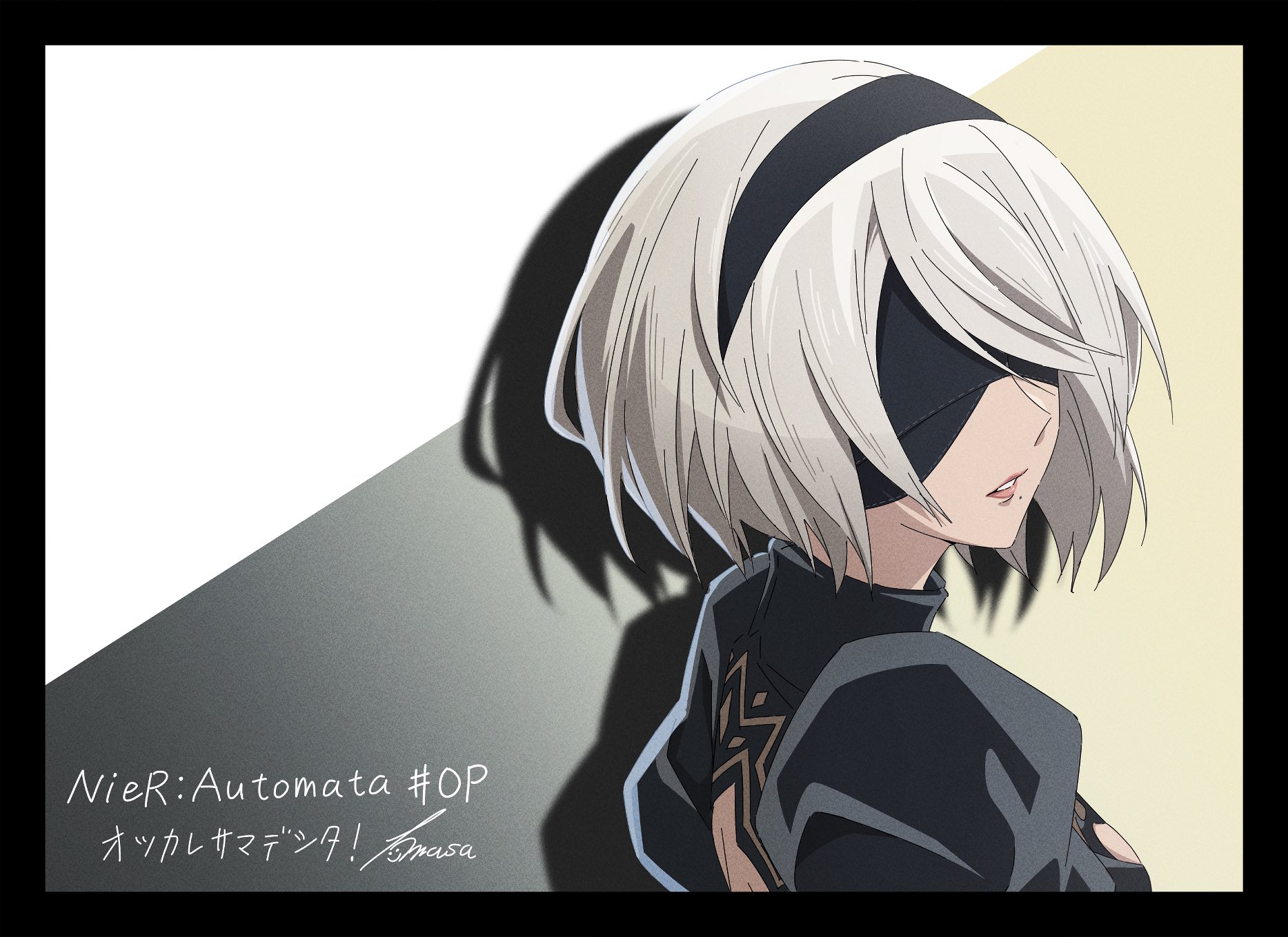 1girl 2b_(nier:automata) anime_coloring back_cutout black_border black_hairband blindfold border breasts cleavage_cutout clothing_cutout commentary_request from_side grey_hair hairband heart highres katorifuta medium_breasts medium_hair nier:automata nier_(series) profile puffy_sleeves signature solo translation_request
