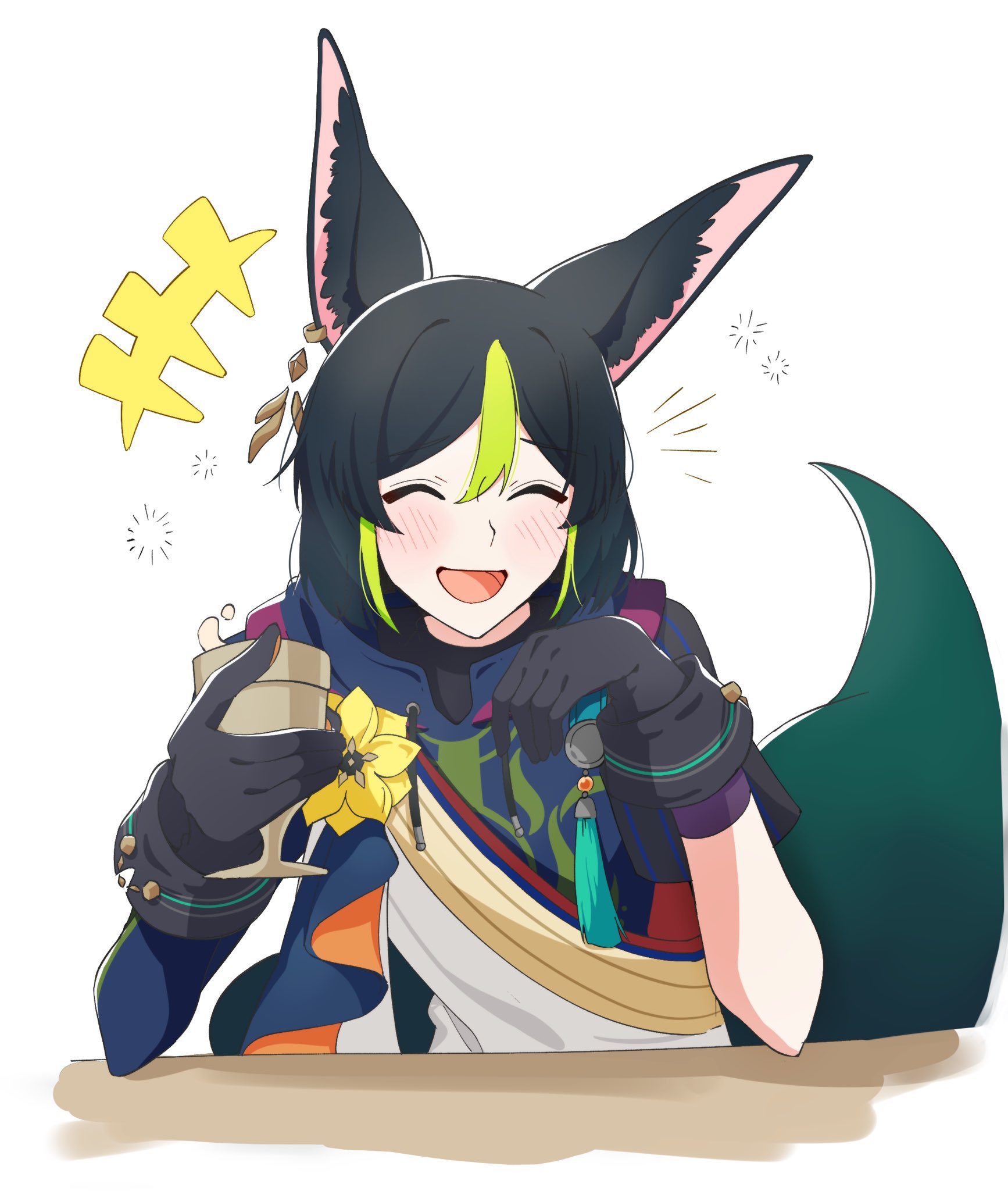 1boy animal_ear_fluff animal_ears black_gloves black_hair closed_eyes cup earrings flower fox_boy fox_ears fox_tail genshin_impact glass gloves green_hair hair_between_eyes highres holding holding_cup hood jewelry male_focus multicolored_hair open_mouth short_hair solo streaked_hair tail tighnari_(genshin_impact) yuki_ma00