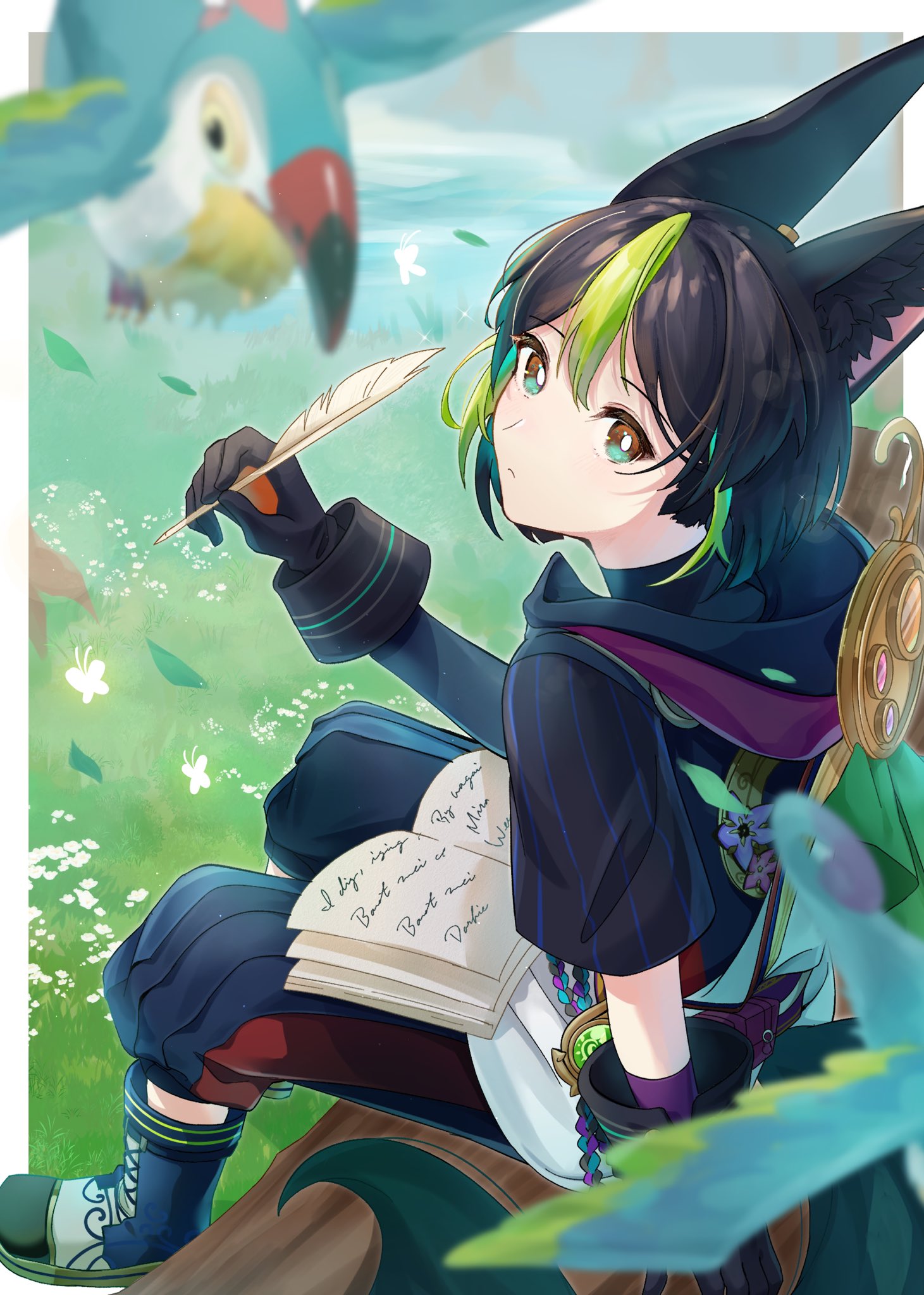 1boy animal_ear_fluff animal_ears aqua_eyes armor bird black_boots black_gloves black_hair boots earrings feathers fox_boy fox_ears fox_tail genshin_impact gloves green_hair hair_between_eyes highres holding holding_feather hood jewelry male_focus multicolored_hair short_hair solo streaked_hair tail tighnari_(genshin_impact) yuki_ma00