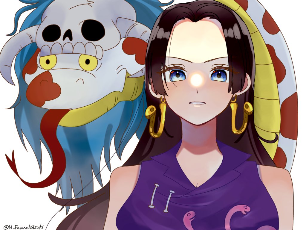1girl animal black_hair blue_eyes boa_hancock commentary_request dress earrings forked_tongue jewelry long_hair n_fuyuakatsuki one_piece parted_lips purple_dress salome_(one_piece) simple_background skull sleeveless snake snake_earrings tongue twitter_username upper_body white_background