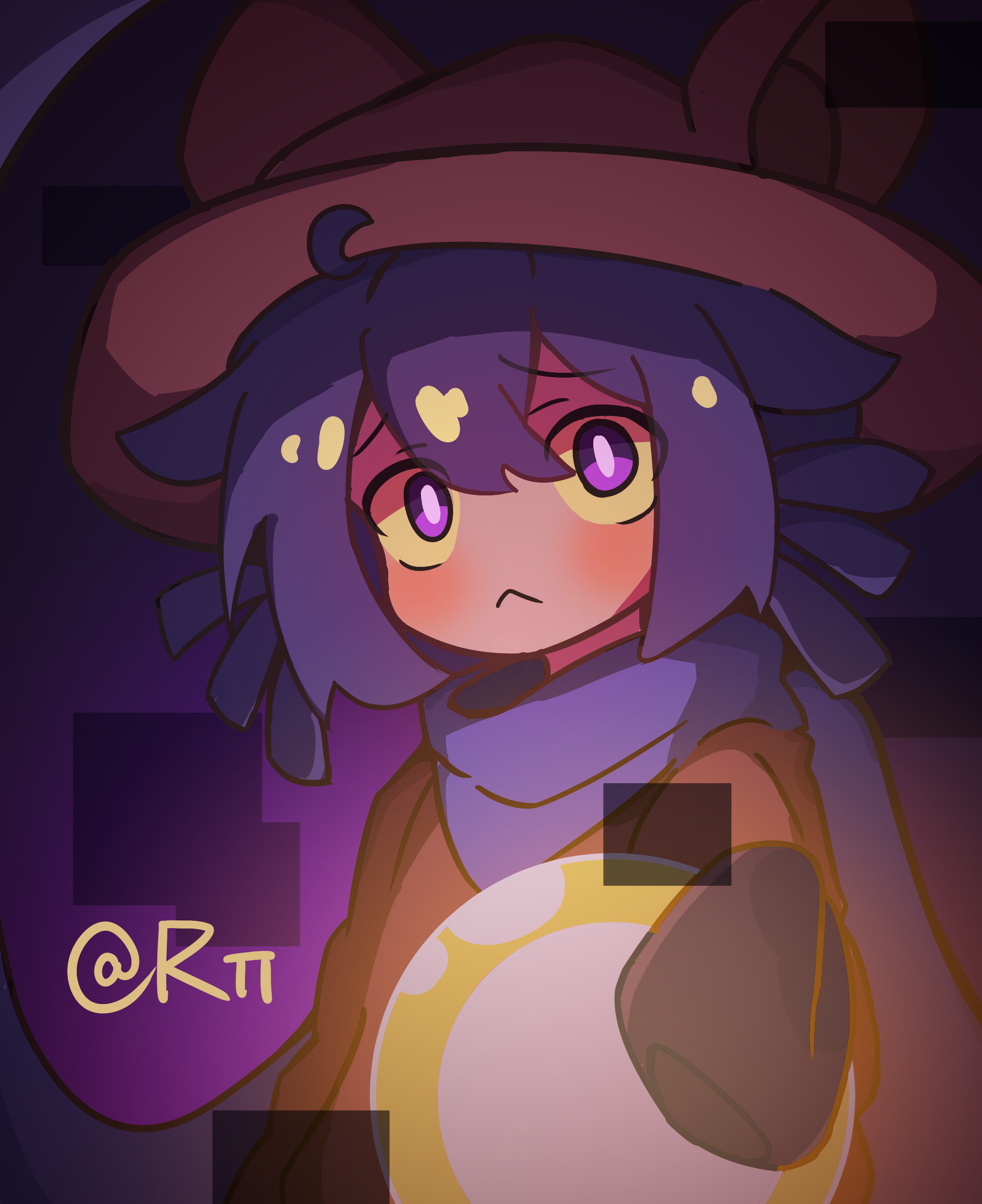 1other absurdres androgynous animal_ear_headwear animal_ears animal_hat blue_scarf blush brown_poncho brown_tunic cat_hat colored_sclera fake_animal_ears frown glitch hat highres holding light_bulb looking_at_viewer niko_(oneshot) oneshot_(game) purple_eyes purple_hair purple_scarf rakey_xwx scarf short_hair sleeves_past_fingers sleeves_past_wrists solo tunic watermark whiskers yellow_sclera