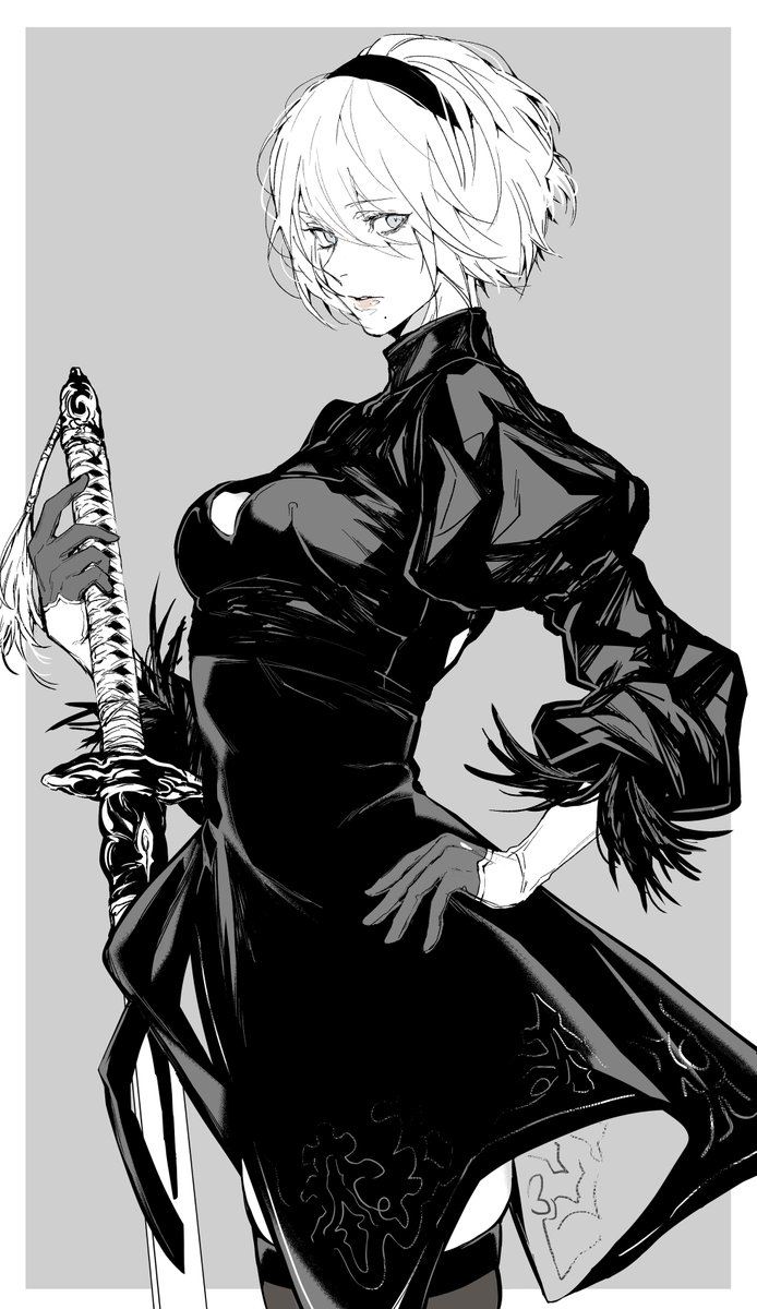 1girl 2b_(nier:automata) breasts cleavage_cutout closed_mouth clothing_cutout commentary dress feather_trim gloves grey_background greyscale hair_ornament hairband hand_on_own_hip highres lips long_sleeves looking_at_viewer medium_breasts mole mole_under_mouth monochrome nier:automata nier_(series) nishiii26miii puffy_sleeves short_dress short_hair simple_background solo sword thighhighs turtleneck weapon