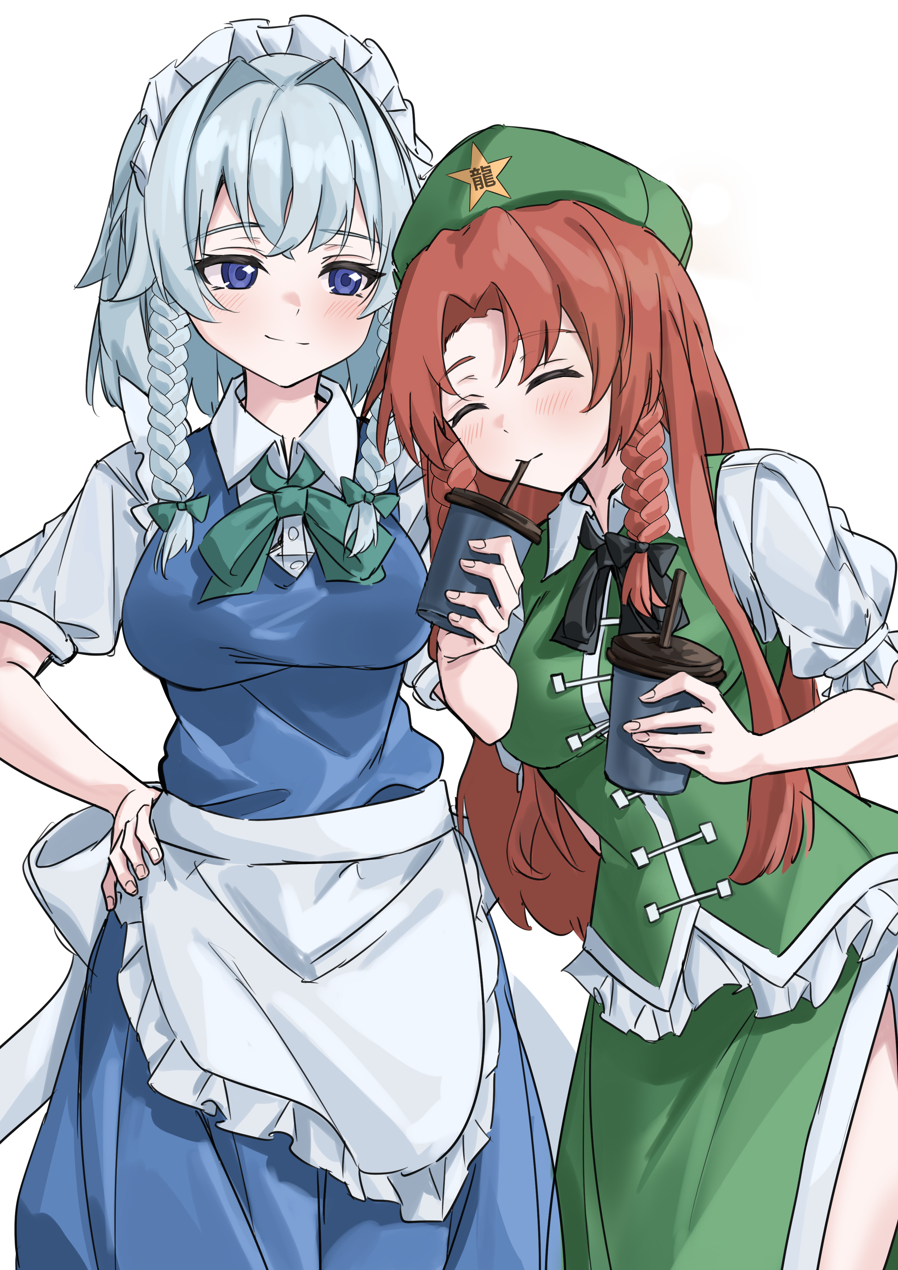2girls absurdres apron beret black_bow black_bowtie blue_dress blue_eyes blush bow bowtie braid breasts closed_eyes closed_mouth collared_shirt commentary cup dress drinking_straw green_bow green_bowtie green_vest grey_hair hand_on_own_hip hat hat_ornament highres holding holding_cup hong_meiling izayoi_sakuya long_hair maid maid_headdress multiple_girls ramiki_(ramiki_3) red_hair sharing_food shirt short_sleeves side_slit smile star_(symbol) star_hat_ornament touhou twin_braids vest white_apron white_shirt