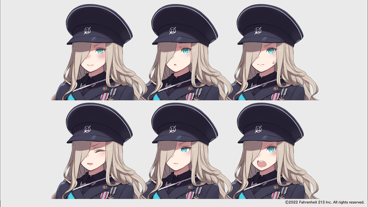 1girl angry blush closed_eyes embarrassed multiple_expressions farfrost_lunafilleigh hat jacket kuroboshi_kouhaku multiple_views official_art open_mouth parted_lips peaked_cap sweatdrop tsurugihime upper_body