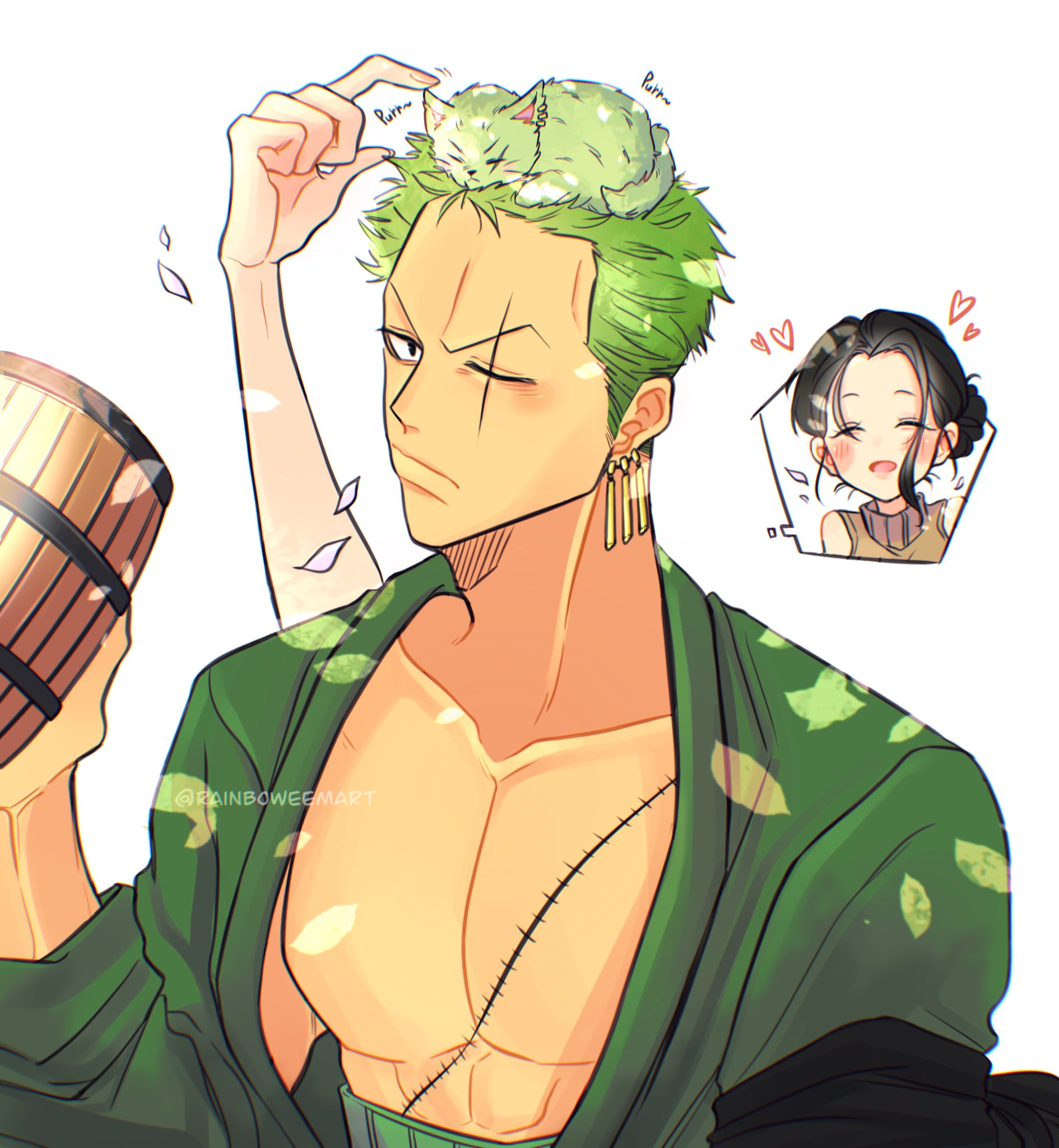 1boy 1girl ^_^ animal animal_on_head bandana_around_arm beer_mug black_hair cat chibi closed_eyes commentary cup disembodied_hand earrings extra_arms green_hair green_kimono hair_bun hana_hana_no_mi heart highres holding holding_cup japanese_clothes jewelry kimono looking_at_viewer mug nico_robin on_head one_eye_closed one_piece petals rainboweem roronoa_zoro scar scar_across_eye scar_on_face short_hair simple_background single_sidelock sleeveless stitched_torso stitches untranslatable_commentary turtleneck upper_body v-shaped_eyebrows whiskers white_background