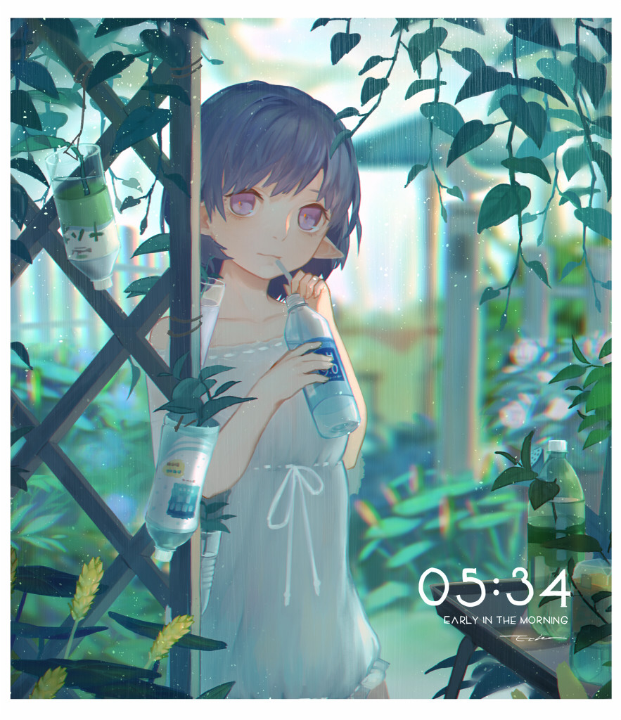 1girl bad_artstation_id bad_id bare_arms bare_shoulders border bottle closed_mouth collarbone cowboy_shot day dress drinking drinking_straw echosdoodle english_text frilled_dress frills glass greenhouse grey_dress holding holding_bottle indoors light_particles light_smile medium_hair nostrils original plant pointy_ears purple_hair ribbon ribbon-trimmed_dress ribbon_trim short_dress solo strapless strapless_dress table timestamp vines waist_ribbon water water_bottle wheat white_border white_ribbon