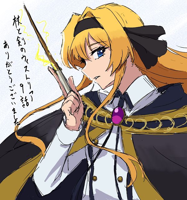 1girl 8red6 black_cape black_headband blonde_hair blue_eyes braid brooch cape electricity electrokinesis fantasy female_focus hand_up headband japanese_text jewelry lihanna_owenzaus long_hair looking_at_viewer magical_girl open_mouth serious shirt solo tsue_to_tsurugi_no_wistoria twintails very_long_hair wand white_shirt