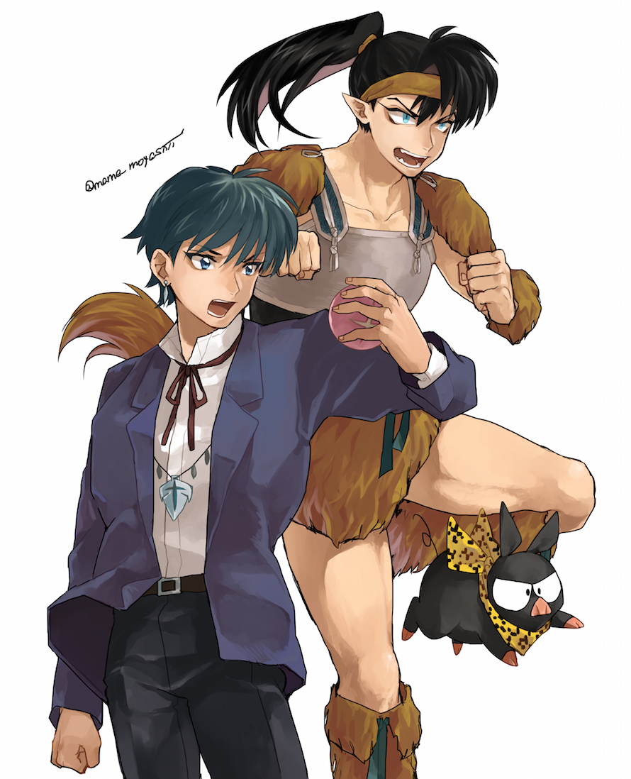 2boys animal black_hair blue_eyes clenched_hands commentary_request creator_connection crossover fangs formal_clothes hibiki_ryouga holding inuyasha jacket juumonji_tsubasa kouga_(inuyasha) kyoukai_no_rinne leg_warmers long_hair looking_to_the_side mame_moyashi multiple_boys multiple_crossover pig ponytail ranma_1/2 simple_background standing standing_on_one_leg suit tail white_background wolf_tail
