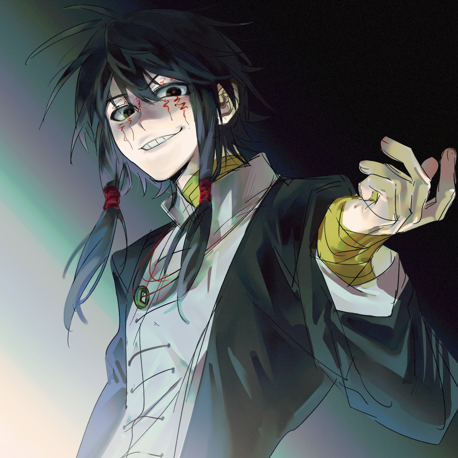 1boy black_eyes black_hair black_jacket chinese_commentary coin coin_on_string commentary_request facepaint grey_shirt grin hand_up highres holed_coin jacket jewelry jizibbb male_focus mole mole_under_eye necklace open_clothes open_jacket red_pupils shirt short_hair_with_long_locks sidelocks sketch smile solo touqi_guaitan upper_body v-shaped_eyebrows ziche_fuzhao
