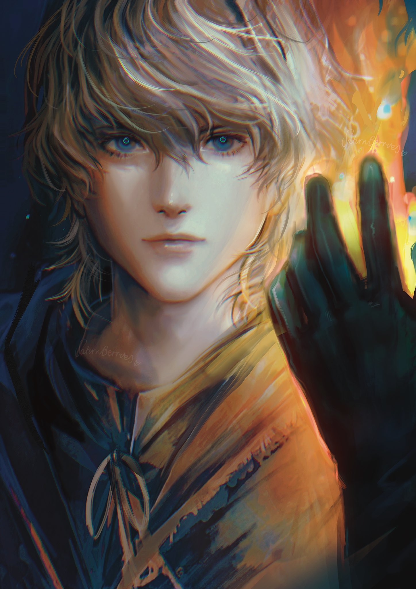 1boy arm_up black_gloves blonde_hair blue_eyes cloak closed_mouth commentary english_commentary eyelashes final_fantasy final_fantasy_xvi fire gloves hair_between_eyes highres joshua_rosfield looking_at_viewer male_focus medium_hair saturnberries solo upper_body