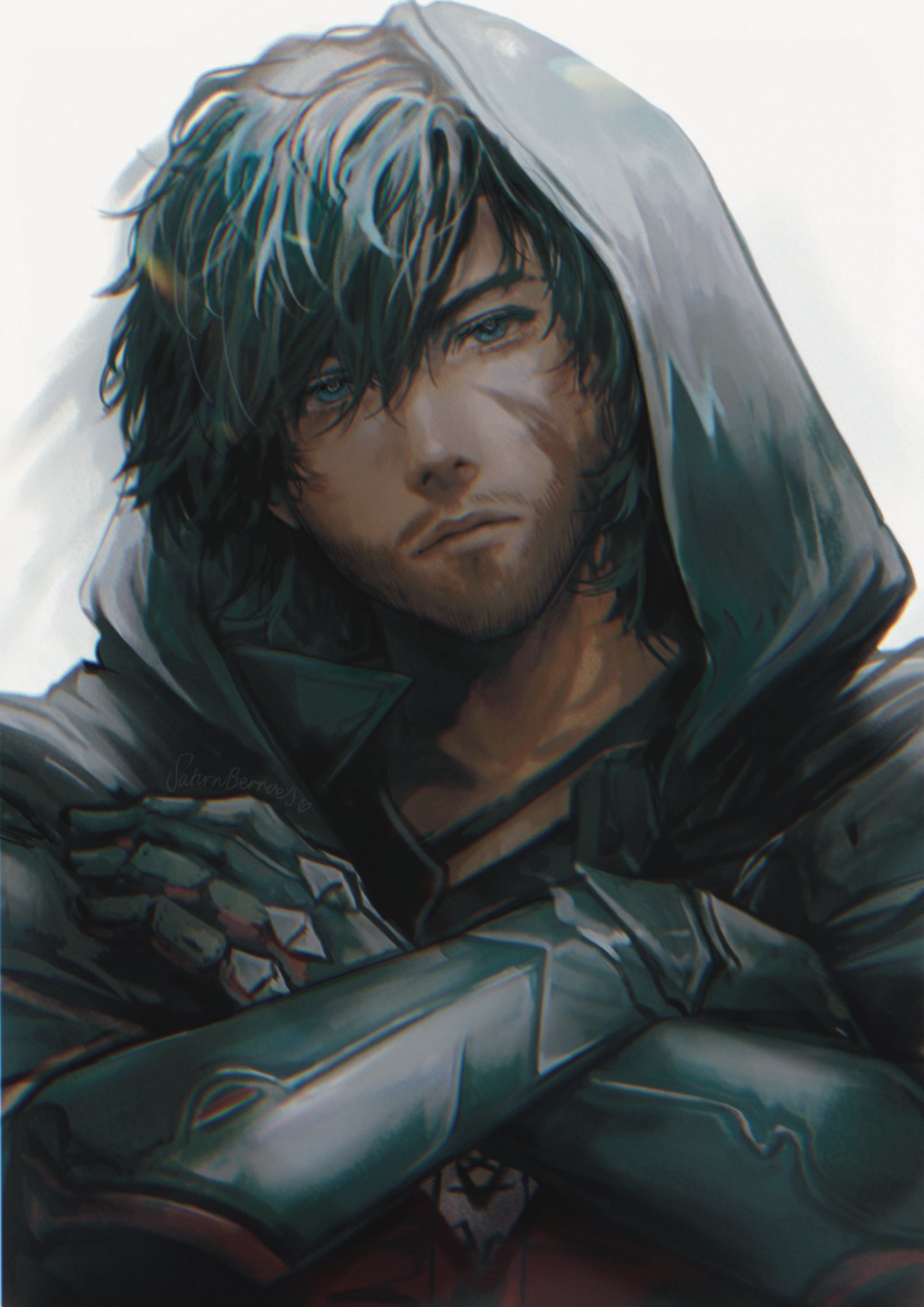 1boy beard black_hair blue_eyes clive_rosfield closed_mouth commentary crossed_arms elbow_gloves english_commentary facial_hair facial_scar final_fantasy final_fantasy_xvi gloves hair_between_eyes highres hood hood_up looking_to_the_side male_focus saturnberries scar scar_on_cheek scar_on_face short_hair simple_background solo upper_body white_background