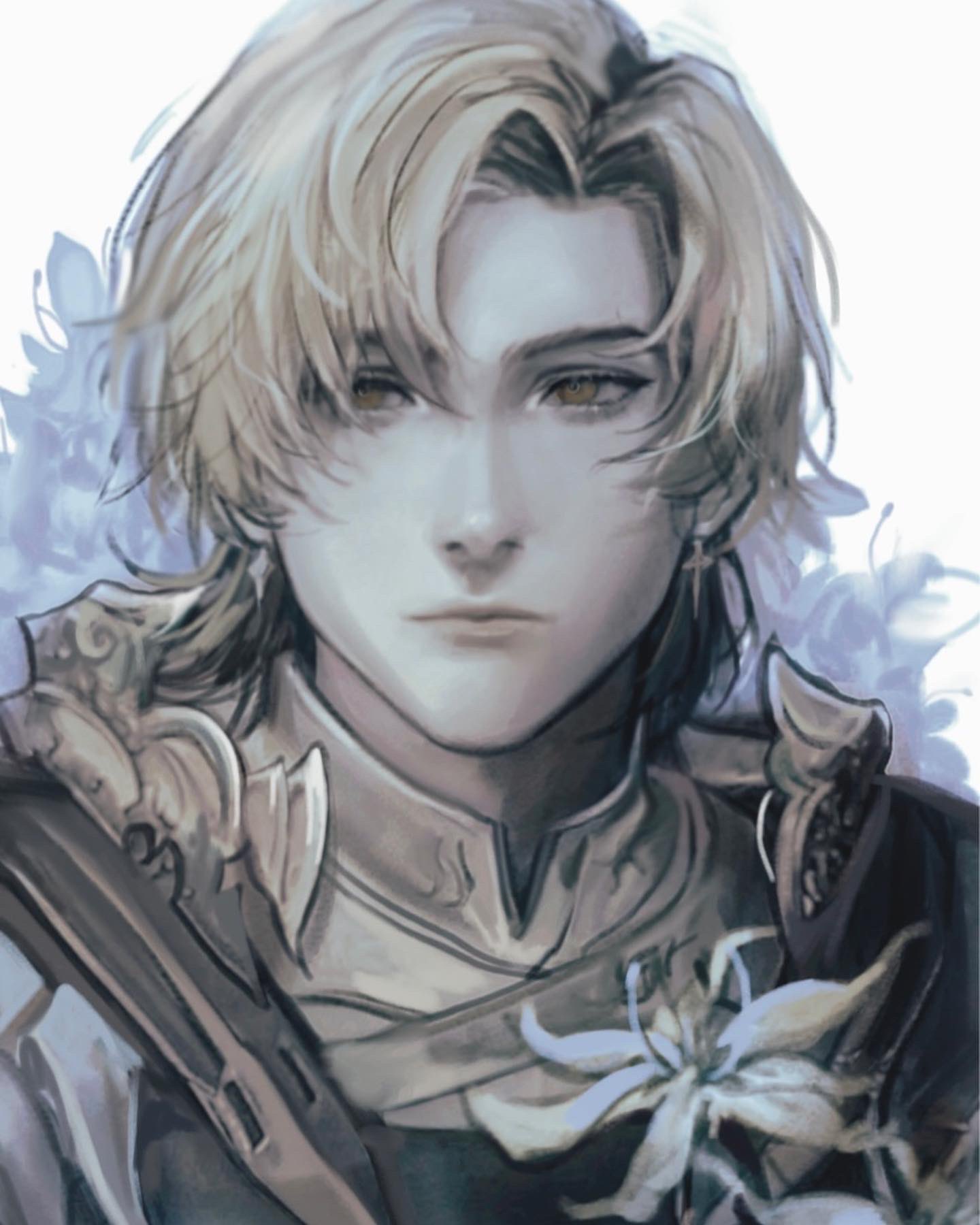 1boy armor blonde_hair closed_mouth commentary curtained_hair dion_lesage ear_piercing earrings english_commentary final_fantasy final_fantasy_xvi flower gorget highres jewelry looking_ahead male_focus parted_bangs pauldrons piercing saturnberries shoulder_armor simple_background solo upper_body white_background white_flower yellow_eyes