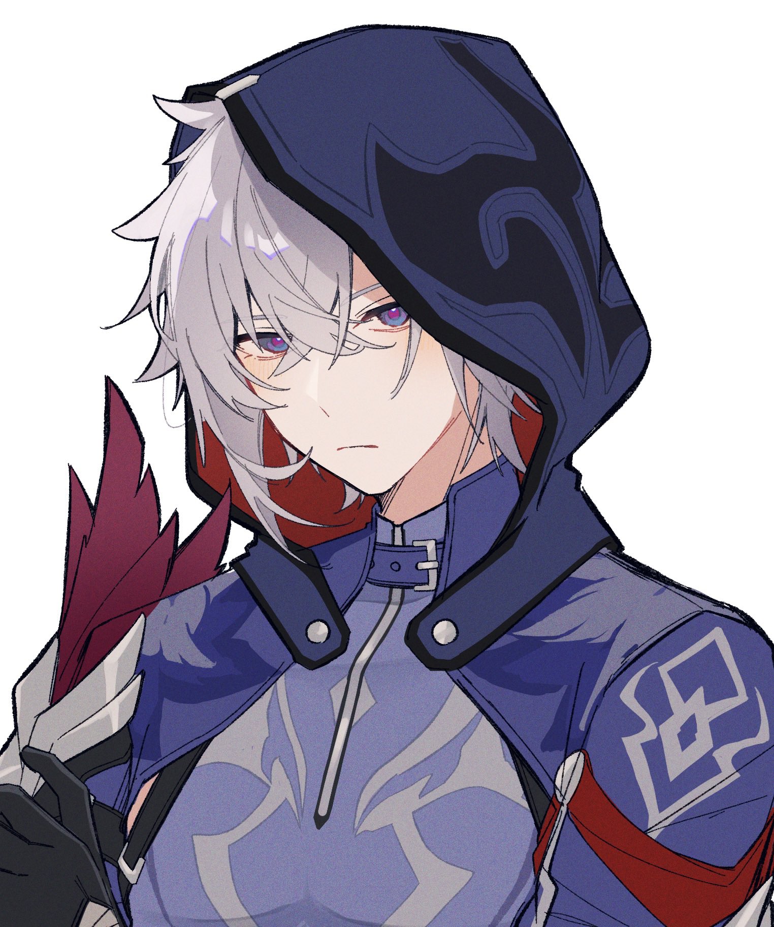 1boy arm_up belt belt_collar black_gloves blue_belt closed_mouth collar commentary_request compression_shirt feathers gloves grey_hair hair_between_eyes highres honkai:_star_rail honkai_(series) hood hood_up light_frown looking_at_viewer male_focus moze_(honkai:_star_rail) oyomaru_07 plume purple_eyes purple_shirt red_feathers shirt simple_background solo upper_body white_background