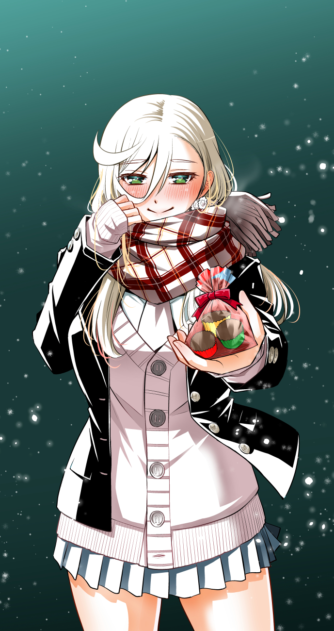1girl aqua_background black_jacket blazer blonde_hair blush cardigan chocolate closed_mouth commentary_request cowboy_shot giving gradient_background green_eyes highres jacket kuzuryuu_hanako long_hair looking_at_viewer open_clothes open_jacket pink_cardigan plaid_clothes plaid_scarf pleated_skirt reaching reaching_towards_viewer scarf school_uniform skirt smile snowing sogabe_toshinori solo swept_bangs yankee_jk_kuzuhana-chan