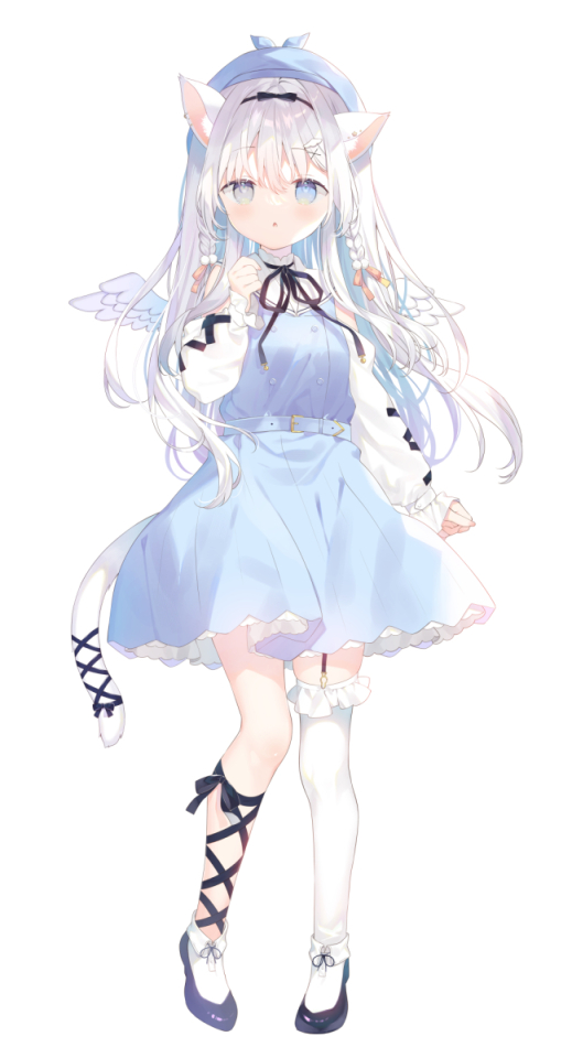1girl :o animal_ears beret black_ribbon black_shoes blue_dress blue_eyes blue_hat braid cat_ears cat_girl cat_tail clothing_cutout commentary_request dress feathered_wings frilled_thighhighs frills full_body garter_straps grey_eyes grey_hair hand_up hat heart heart-shaped_pupils heterochromia indie_virtual_youtuber long_hair long_sleeves looking_at_viewer mini_wings neck_ribbon parted_lips puffy_long_sleeves puffy_sleeves ribbon sailor_collar sailor_dress shirt shoes shoulder_cutout simple_background single_thighhigh sleeveless sleeveless_dress sleeves_past_wrists solo sorashi_purumu standing standing_on_one_leg symbol-shaped_pupils tail thighhighs twin_braids very_long_hair virtual_youtuber white_background white_sailor_collar white_shirt white_thighhighs white_wings wings yuizaki_kazuya