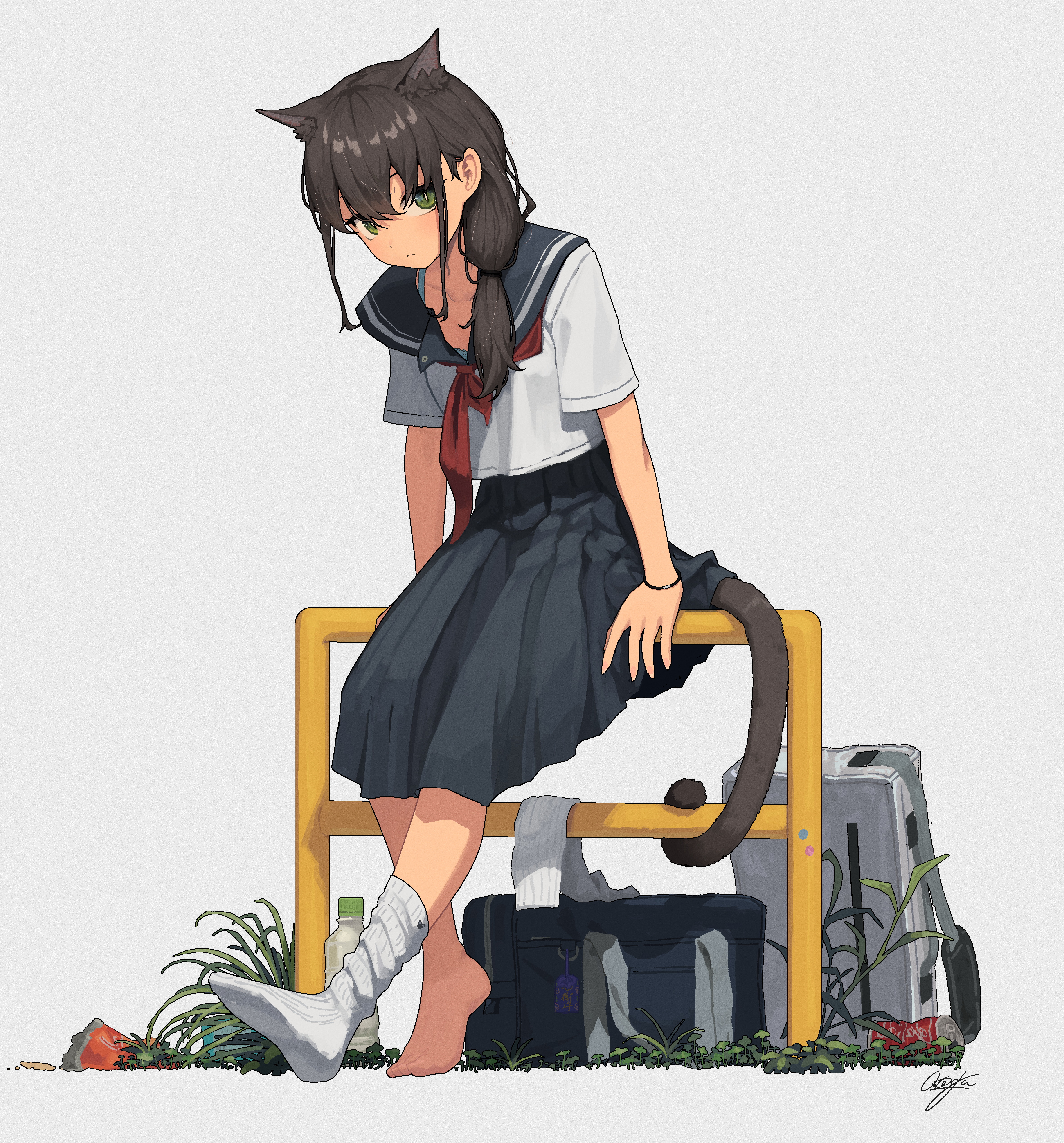 1girl absurdres animal_ears bag barefoot black_hair black_sailor_collar black_skirt cat_ears commentary_request eyebrows_hidden_by_hair green_eyes grey_background hair_between_eyes hair_over_shoulder highres looking_at_viewer low_ponytail neckerchief no_shoes on_railing original pleated_skirt ponytail railing red_neckerchief ribbed_socks sailor_collar school_bag school_uniform serafuku shirt short_sleeves simple_background single_sock sitting skirt socks solo unworn_socks white_shirt white_socks wozora